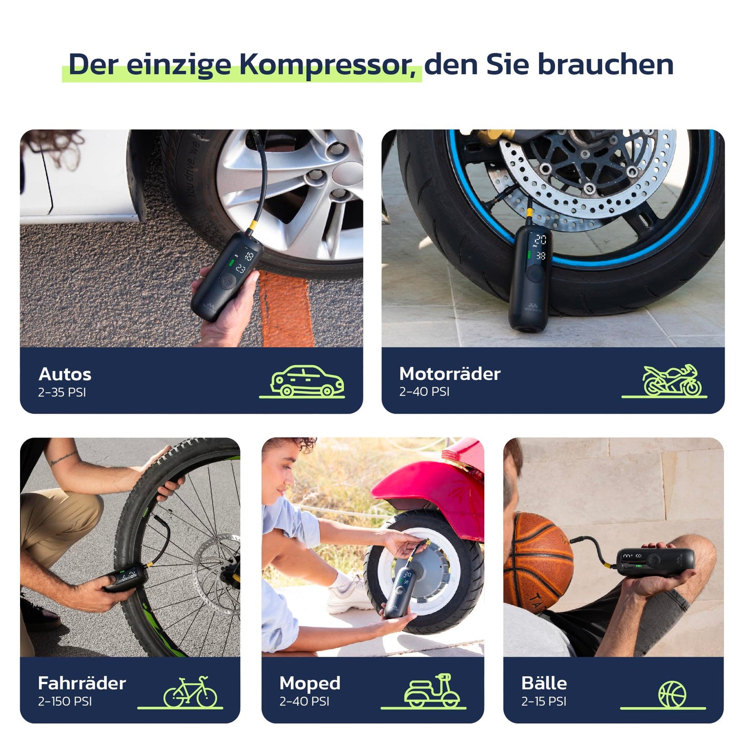 Woowind LP1 Electric Air Pump & Battery Compressor (150 PSI/10.3 Bar), Battery Air Pump for Car, Motorcycle, Scooter, Balls - Portable + Digital Display + LED.