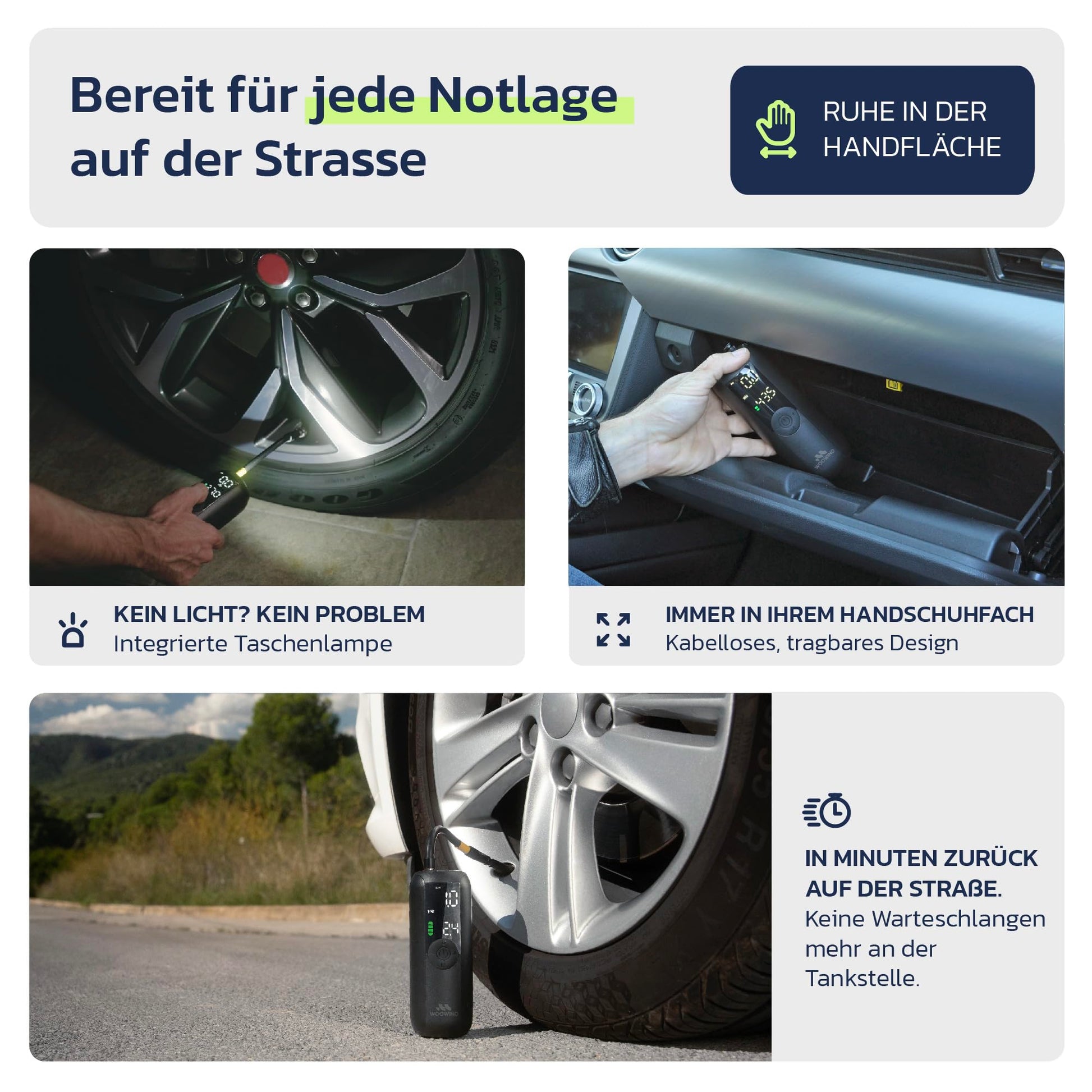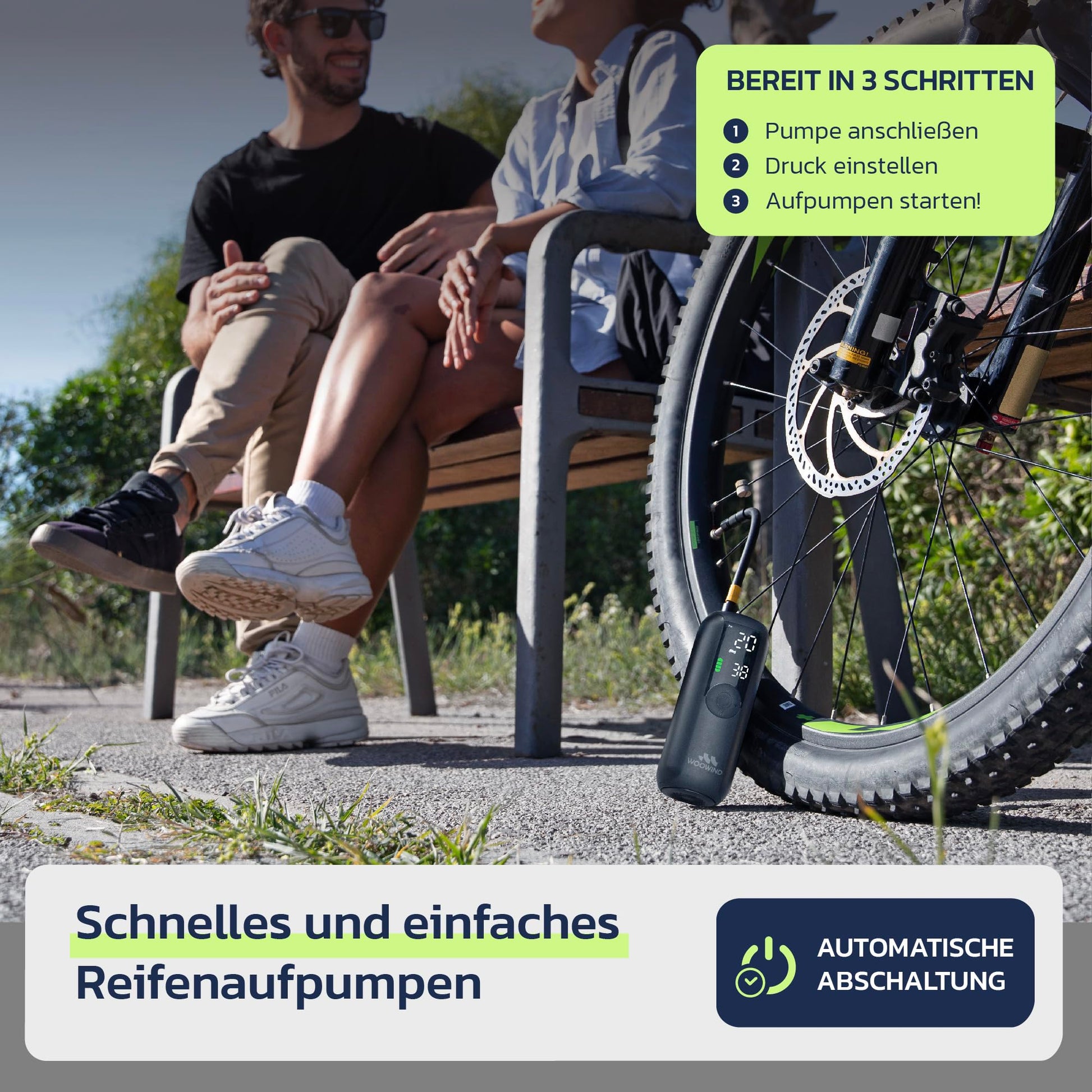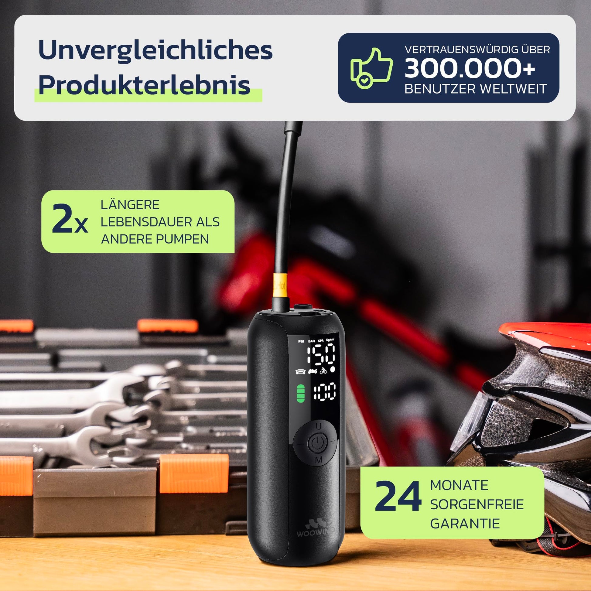["ELECTRIC AIR PUMP WITH 150 PSI/10.3 BAR: Fastest battery compressor for car & bike (<2 min. from 28→34 PSI). Ideal as electric bike pump or motorcycle air pump.","PREMIUM ELECTRIC BIKE PUMP FOR ON-THE-GO: 50% longer battery life vs. competition + 6 months standby. Wireless air pump with USB-C – no 12V connection needed!","PRECISE BIKE PUMP WITH DIGITAL DISPLAY: Electric air pump with 0.5 PSI accuracy + 4 presets. Automatic shut-off for perfect tire pressure.","ALL-IN-ONE SOLUTION AS BIKE & CAR PUMP: Includes adapters for bikes, motorcycles, scooters, and balls. Perfect as bike accessory or electric bike pump for tours.","MULTIFUNCTION: ELECTRIC AIR PUMP + LED LIGHT: Integrated emergency light for night use. Compact air pump fits in any backpack!","PACKAGE CONTENTS: Electric air pump x1, Flexible hose (Schrader valve) x1, Presta valve adapter x1, Dunlop valve adapter x1, Swim ring nozzle x1, Ball needle x1, Carrying bag x1, USB charging cable x1, User manual x1","WARRANTY: 24 months from date of purchase","Note: Not for SUPs/12V devices"]