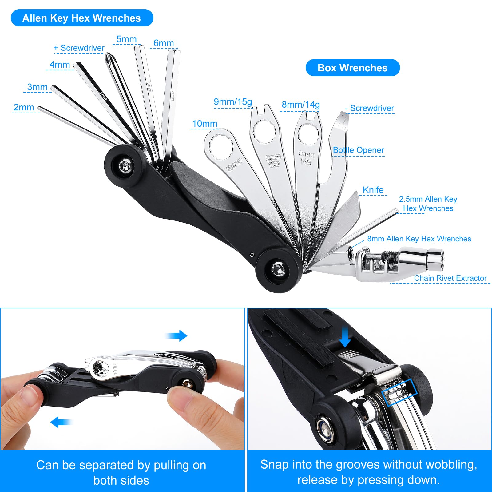 17-in-1 Bicycle Multitool Kit: 8/9/10 mm Ring Wrench, +/- Screwdriver, 2/2.5/3/4/5/6/8 mm Allen Wrench, 0.127"/0.160" Spoke Key, Bottle Opener, Plastic Tire Lever, Bicycle Chain Tool, and Stainless Steel Knife.