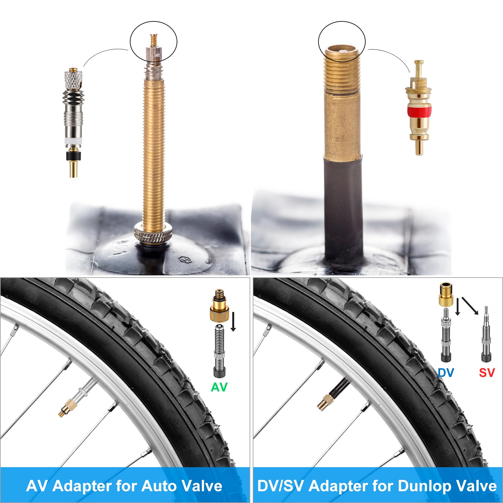 "Bicycle Repair Kit: 17 in 1 Bicycle Tool Set, 1 Bicycle Spoke Key, Puncture Kit (2 Metal Tire Levers / 2 Nylon Tire Bars / 12 Self-adhesive Tire Patches / 1 Metal Tire File), 4 Valves (Schrader & Presta), 4 Bicycle Valve Adapters, 1 Valve Core Tool, 4 Valve Caps, 4 Valve Core Tubes, and 1 black tool bag.