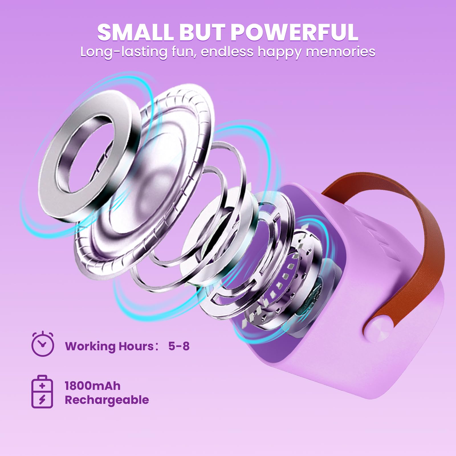 ["Highlights: ☑️ Powerful yet lightweight, in a mini size for ultimate portability. ☑️ Easy connection via Bluetooth and support for a TF card. Compatible with all popular apps (like YouTube, Tiktok). ☑️ Functions as a speaker and player with dancing lights. The colorful LED lights blink in sync with the music rhythm. ☑️ After 10,000 anti-drop tests, the kid-friendly design ensures long-lasting durability. ☑️ 100% popular gift.","🎤【Karaoke Machine with 2 Microphones】The Bluetooth karaoke machine with 2 wireless microphones, it automatically connects to the speaker when turned on, its range up to 10m, can adjust human voice/echo effect/music volume separately. The speaker supports Bluetooth 5.0, compatible with smartphones, PCs, laptops, and other music apps, the connection is quick and stable. Works as a karaoke machine and normal speaking microphone.","🎤【Portable Karaoke Machine】The portable karaoke machine for kids and adults, its size 2.95*3.34*2.55 inches, only 455g, easily lifted by children to take it anywhere. High quality and powerful sound provide a wonderful KTV live environment. And dynamic LED lights liven up the play, great for KTV, parties, gatherings, outdoor activities. Supports TF memory with MP3 songs, sing, practice singing, play music, listen to songs as you like.","💿【4 Modes Kids Karaoke Machine】The kids karaoke machine has 4 types of magical voices, easy to use. Cute appearance, fun and interesting for kids. Equipped with a powerful audio driver and advanced digital signal processor that make the sound clearer and avoid annoying microphone feedback. The LED lights pulsate with the music rhythm, kids will love the dancing lights that go freely with the sound.","🎼【Long Playtime Karaoke Machine】The built-in battery of the karaoke machine can work for 5-10 hours after fully charged. Enjoy karaoke fun without interruption. Perfect for birthday, Christmas, party, and other outdoor activities. This kids karaoke machine can be used as a karaoke system, music player, microphone speaker, and more. (You can also use the speaker without the microphone.)","🎁【Perfect Gifts for Kids】This karaoke machine is an essential toy for family entertainment, perfect for parties, birthdays, and encourages everyone to join in. Its charming LED design and children's favorite color, a perfect gift for young singers who are passionate about singing, suitable for ages 3, 4, 5, 6, 7, 8, 9, 10, 11, 12-year-old girls, boys, teenagers, and toddlers. We offer a 1-year warranty and 30-day return policy.","❤️Warm Note: To adjust the echo, double click on the microphone button (with the microphone symbol) first to switch to reverb mode, then press the + - button to freely adjust the reverb/echo volume. (Note: Mic heads too close to the speaker create sharp and strange sounds, the common sound feedback is, so try to avoid mic heads too close to the speaker)."]