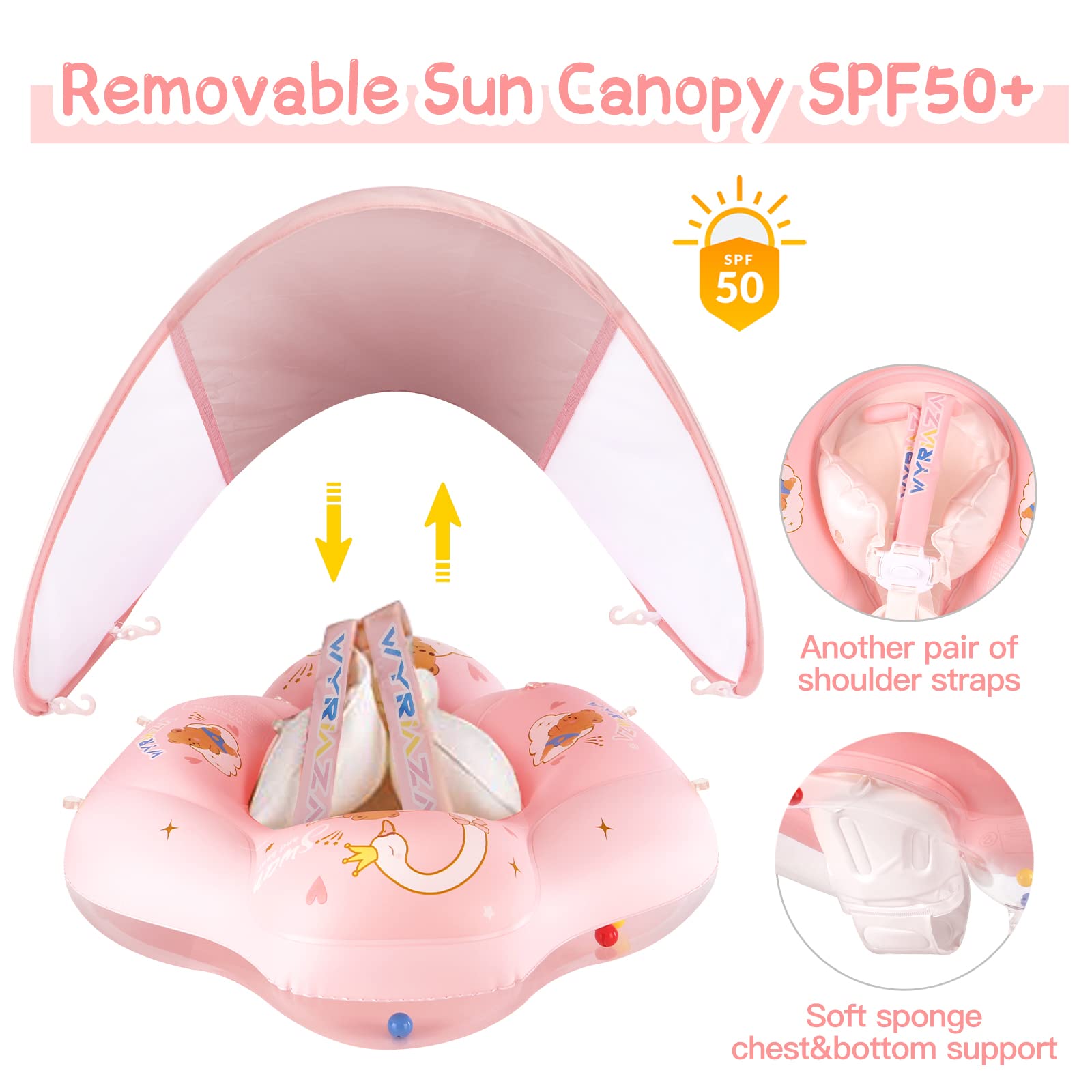 WYRIAZA baby swimming ring with sunshade SPF 50+. Upgrade baby swimming ring 8-16kgs with balance ball to prevent rollover (L 6-36 months).