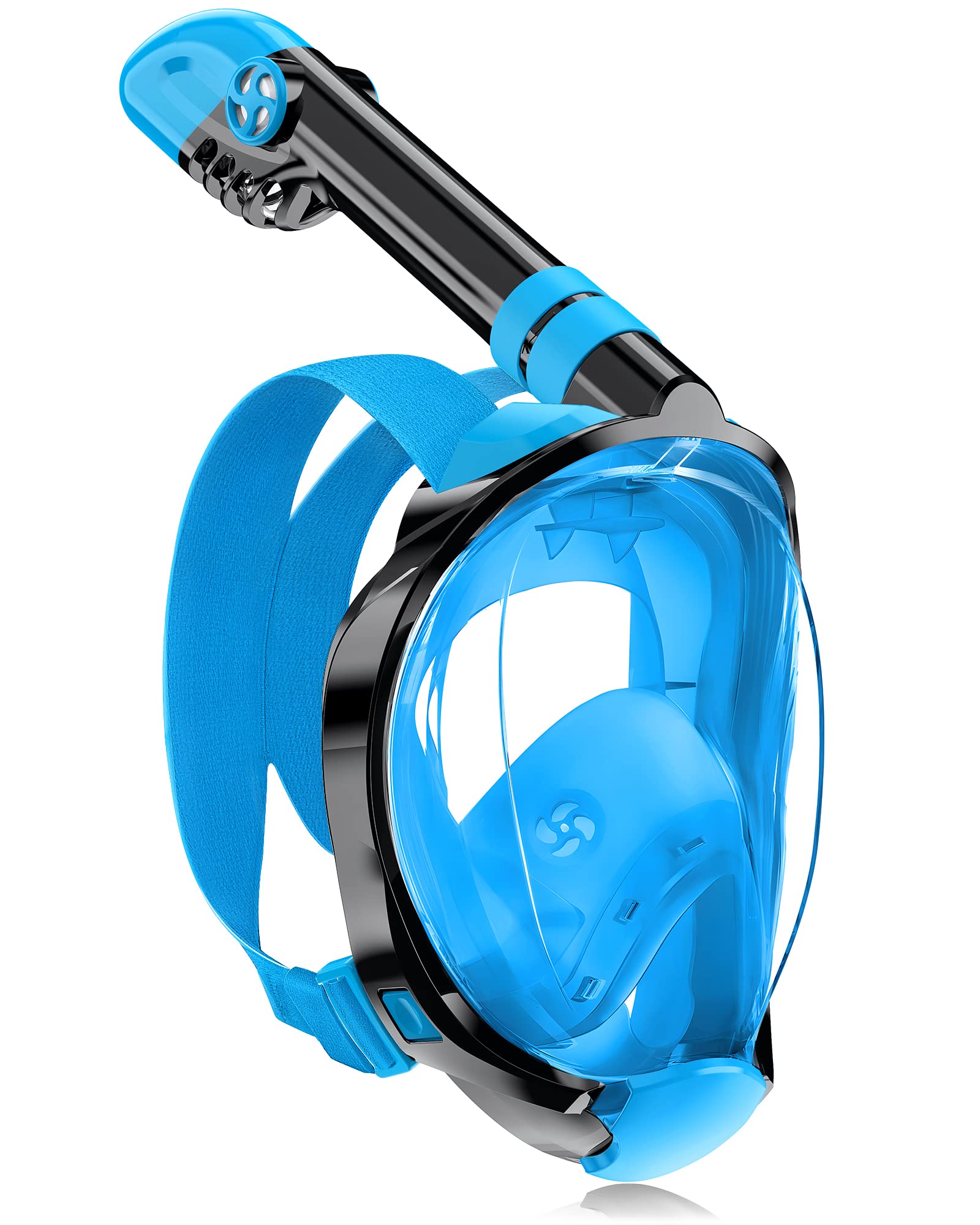 ["Dry top system breathing: X99 snorkel mask full face has twice as much air as other standard snorkel masks, it provides maximum air supply. Double airflow channels that effectively isolate oxygen and carbon dioxide. Separate breathing chambers allow air to flow away from the main lens which helps to prevent fogging and allows you to snorkel longer.","Anti-fog coatings: odourless medical grade silicone offers you a soft and tight fit for your face. The acrylic snorkel mask is scratch-resistant, collision-proof and does not fog, your vision will not be affected by anything. You are guaranteed to see more fish and sea creatures than ever before.","Comfortable to wear and easy to use: the diving mask covers the whole face. Two sizes ensure the right fit. The clip-on elastic band design allows you to work independently. You can remove or wear the snorkel mask at any time in an emergency.","Panoramic view and camera mount support: X99 diving mask uses a flat lens instead of a curve lens to avoid distorting the view. The full face design allows you to enjoy the 180 degree panoramic view underwater. Compatible with a detachable underwater camera that helps you capture the fantastic underwater world.","The best summer gift: the diving mask can be easily disassembled, and then put in a carry bag, which is not only portable, but also beautiful and personalized. It is the best choice as a gift for your friends and famalies this summer."]