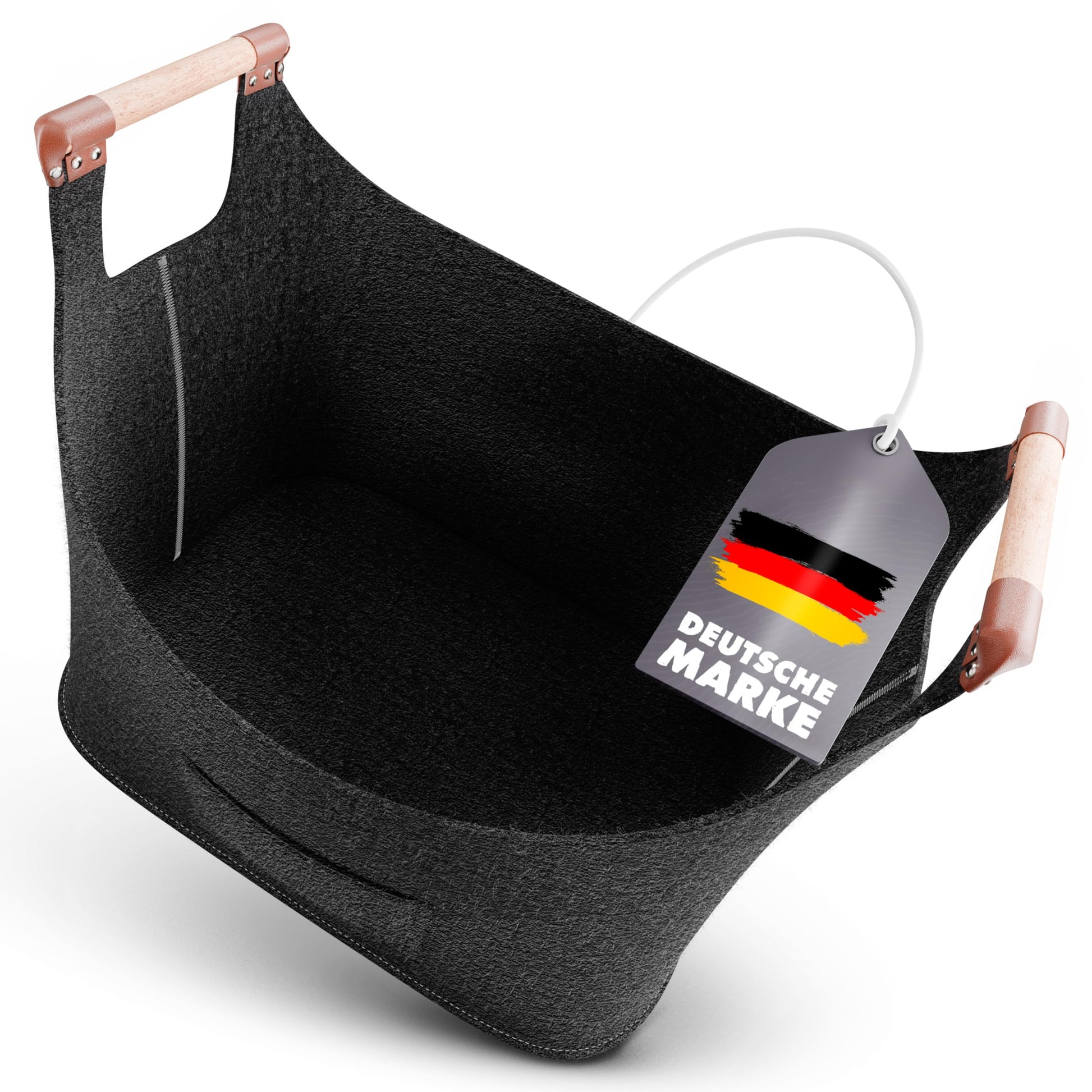 Xcelenze - XXL wooden basket for fireplace logs with wooden handle felt basket extra thick felt fireplace log basket felt bag foldable also as shopping basket car & storage basket for wood newspaper (dark gray)