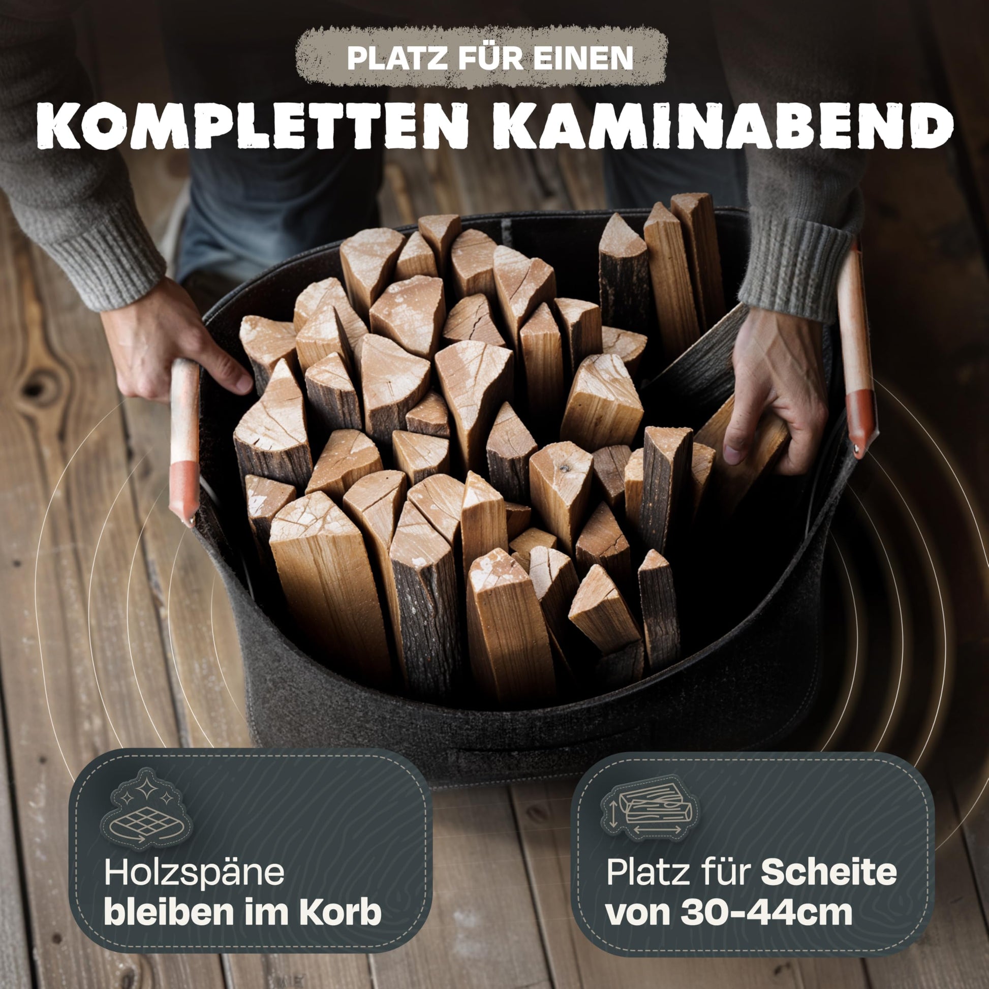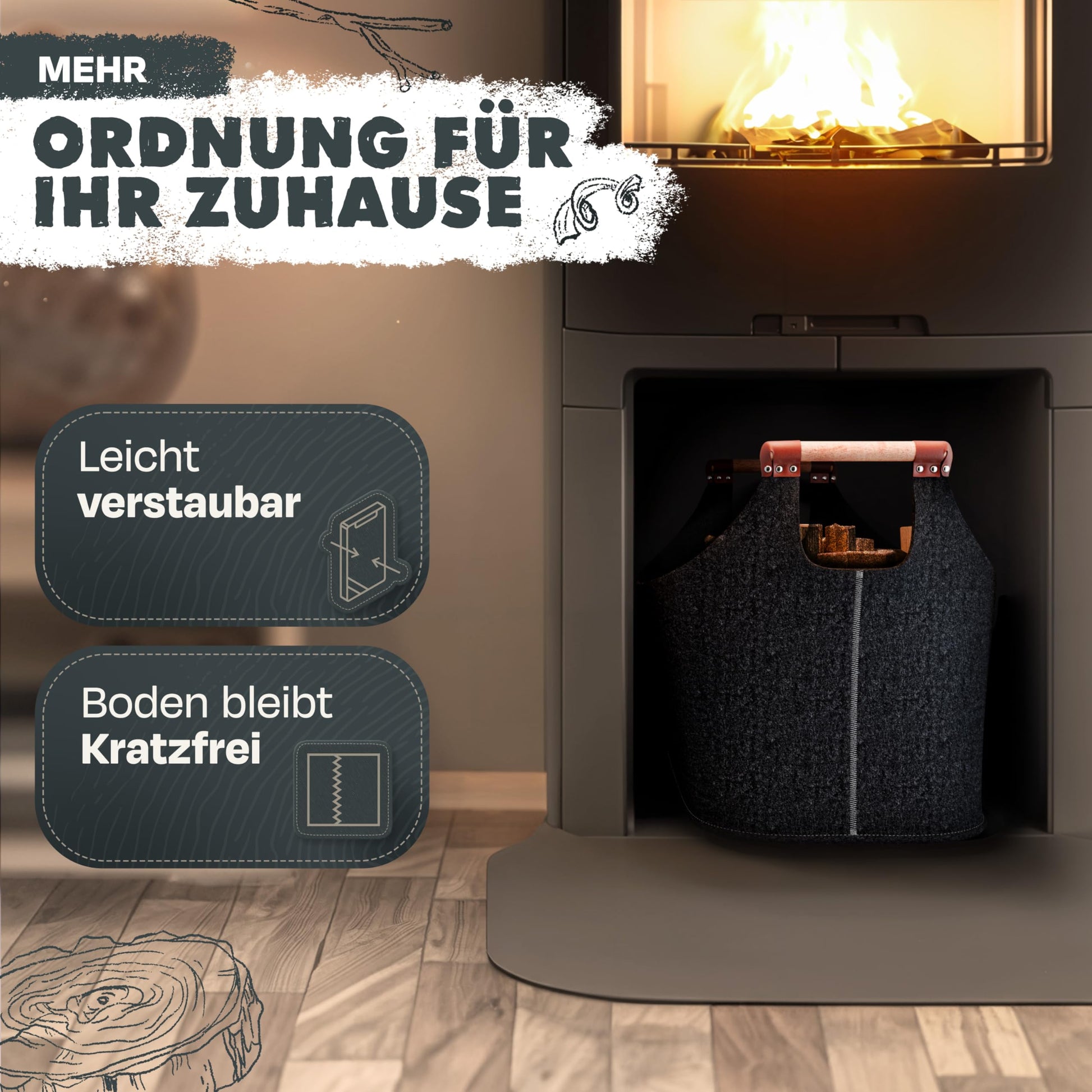 ["EXTRA STRONG - 5mm thick felt and wooden handles make the fireplace wood basket sturdy enough to carry & store wood for a complete cozy fireplace evening","PROTECTS THE FLOOR - The wood basket, felt basket with extra soft felt protects the floor from hard and sharp objects. Also, even small chips remain in the felt bag","VERSATILE USE - In addition to firewood for the fireplace, there is space in the felt bag for toys, blankets, magazines, and other household items. The perfect storage basket also for shopping","DESIGN FOR WELL-BEING - The subtle color tone of the fireplace wood bag blends in as a fashionable accessory in the home and creates an atmosphere of coziness","EXTRA LARGE & FOLDABLE - Firewood basket can be folded small and stored. The large wood bag offers enough space for firewood for a completely cozy fireplace evening"]