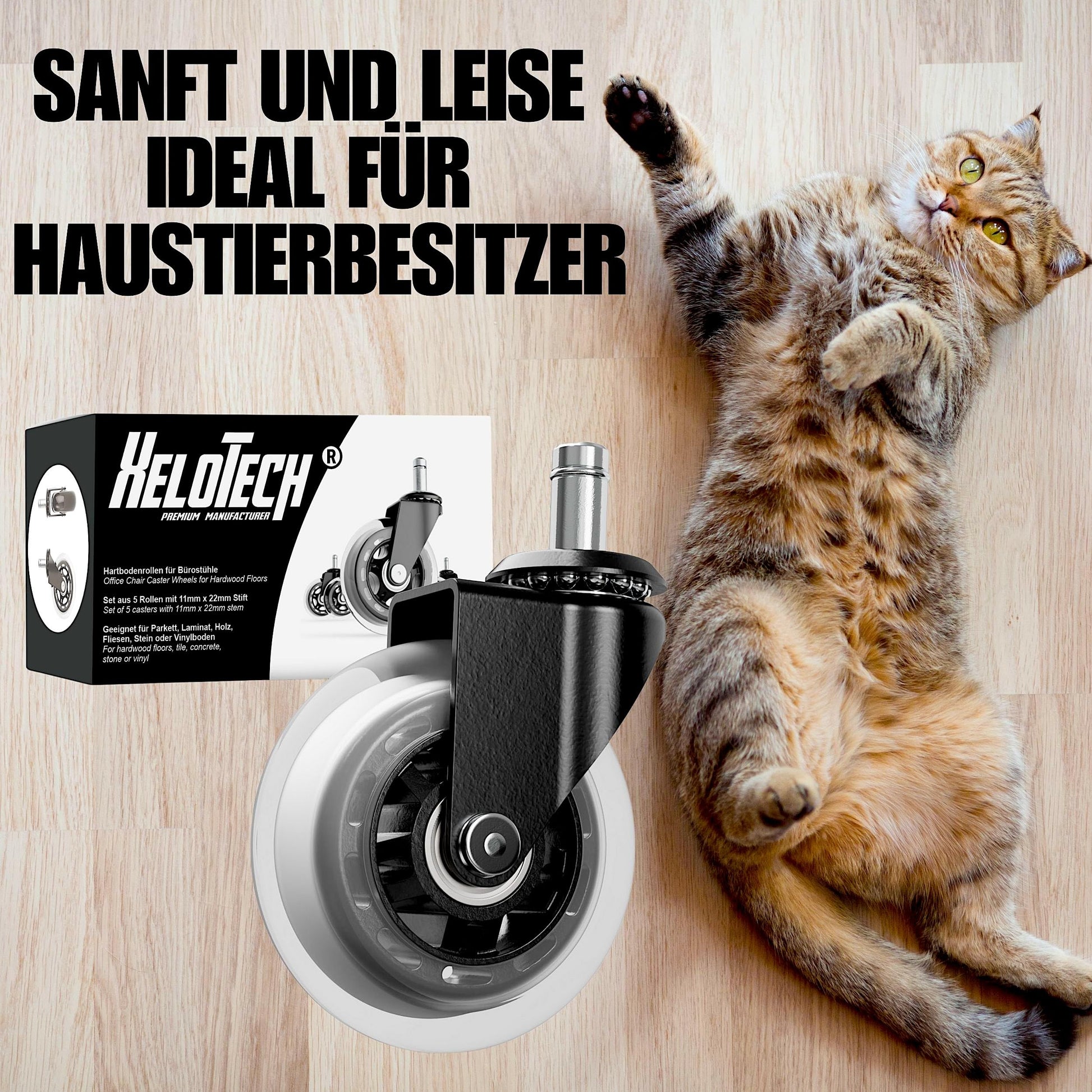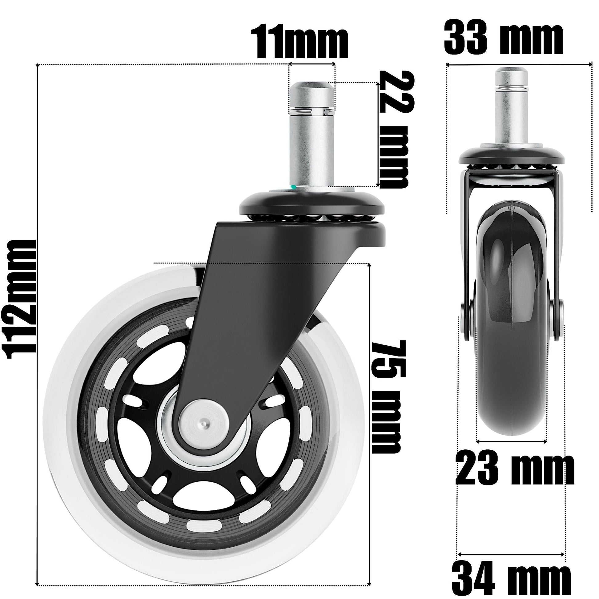 ["[Attention important] - Please determine the correct pen size to the millimeter before purchasing! This will save you time and nerves. These casters have an 11mm x 22mm stem and fit 90% of office chairs. (But they do not fit on IKEA chairs)","[German company] - For 7 years we have been producing these high-quality casters and have over 100,000 satisfied customers in Germany and Austria who appreciate our quality and service.","[Safety for all hard floors] - Protect your floor with our gentle yet highly durable polyurethane casters for your office chair. Our gentle casters do not leave dark or black stripes on the floor covering. Perfect for tiles, parquet, laminate, wood, marble, granite, stone, concrete, vinyl flooring, wooden floors.","[Silent, Smooth, Durable] - Glide completely noiselessly on your office chair. Even in the evening in the home office, no one will be disturbed by your work anymore. Perfect for gamers who like to play at night.","[For all chairs with 11mm x 22mm stems] - Suitable for every desk chair that supports 11mm x 22mm casters (Note: IKEA uses 10mm casters, also many Topstar office chairs have 10mm holes).","[Design] - These casters will upgrade your office chair because they have a unique and very modern design. The casters are unbraked."]