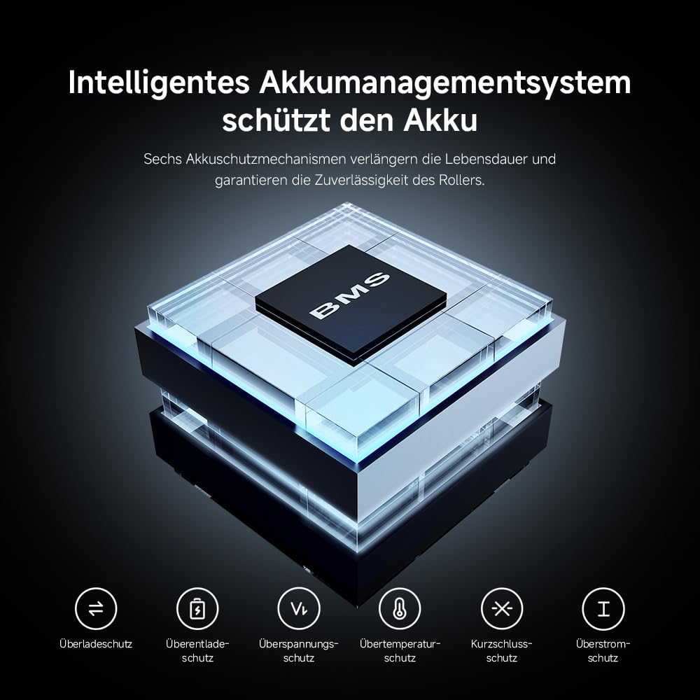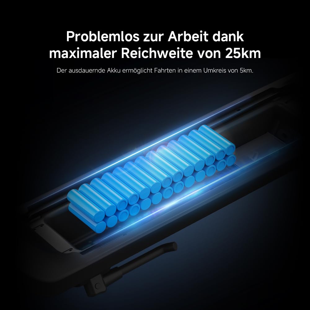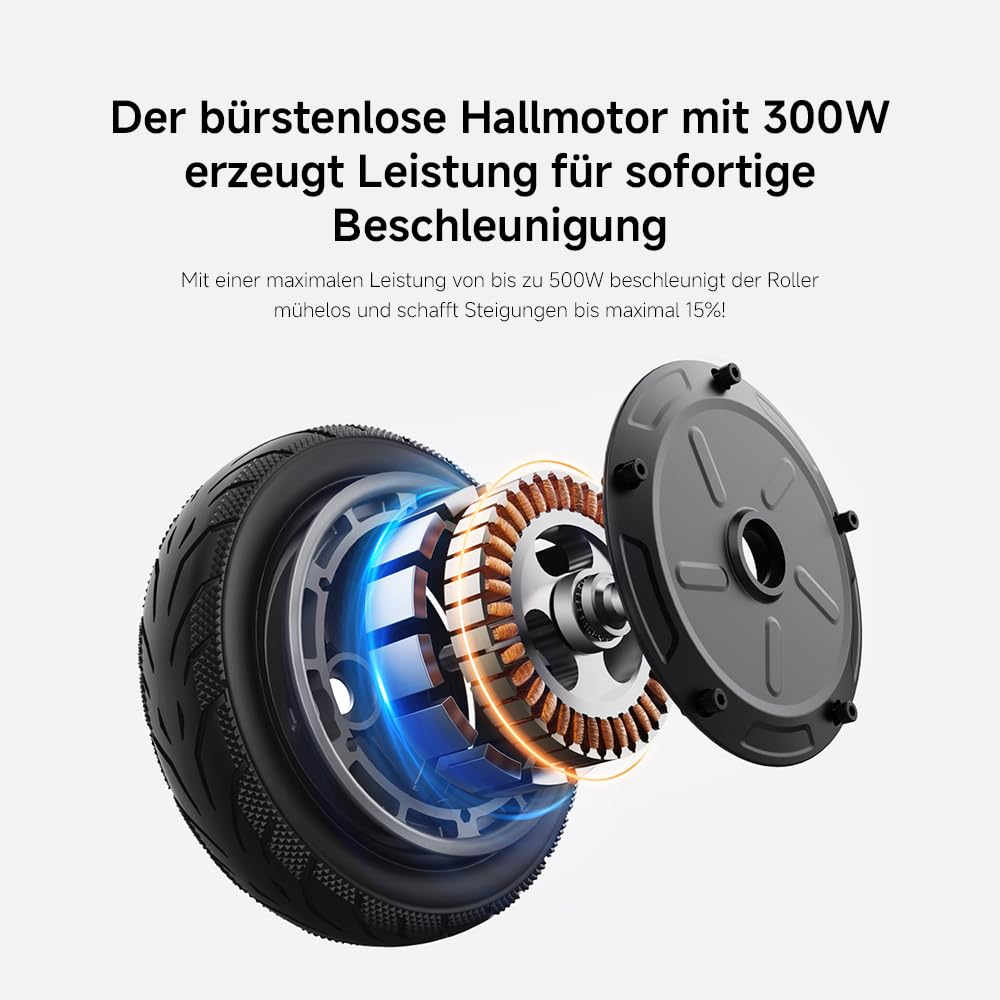 ["E-Scooter with road approval (ABE) for use on public roads (data confirmation included with vehicle identification number (VIN) + found on the underside of the scooter)","500Wh Lithium Ion battery with a long range of up to 25km at a tire pressure of 3.5 bar (also depending on road conditions, height & weight), fully rechargeable in a few hours","Ultra high motor power (300 Watt continuous power) allows for uphill driving of up to 15 percent and fast acceleration in sport mode (3 driving modes: pedestrian, standard, and sport)","10 inch tires with run-flat properties resist air loss in case of a flat tire and allow the E-Scooter to continue driving at reduced speed","Electric and drum brake with energy recovery, turn signals, front light, brake light and side reflectors for maximum safety in traffic"]