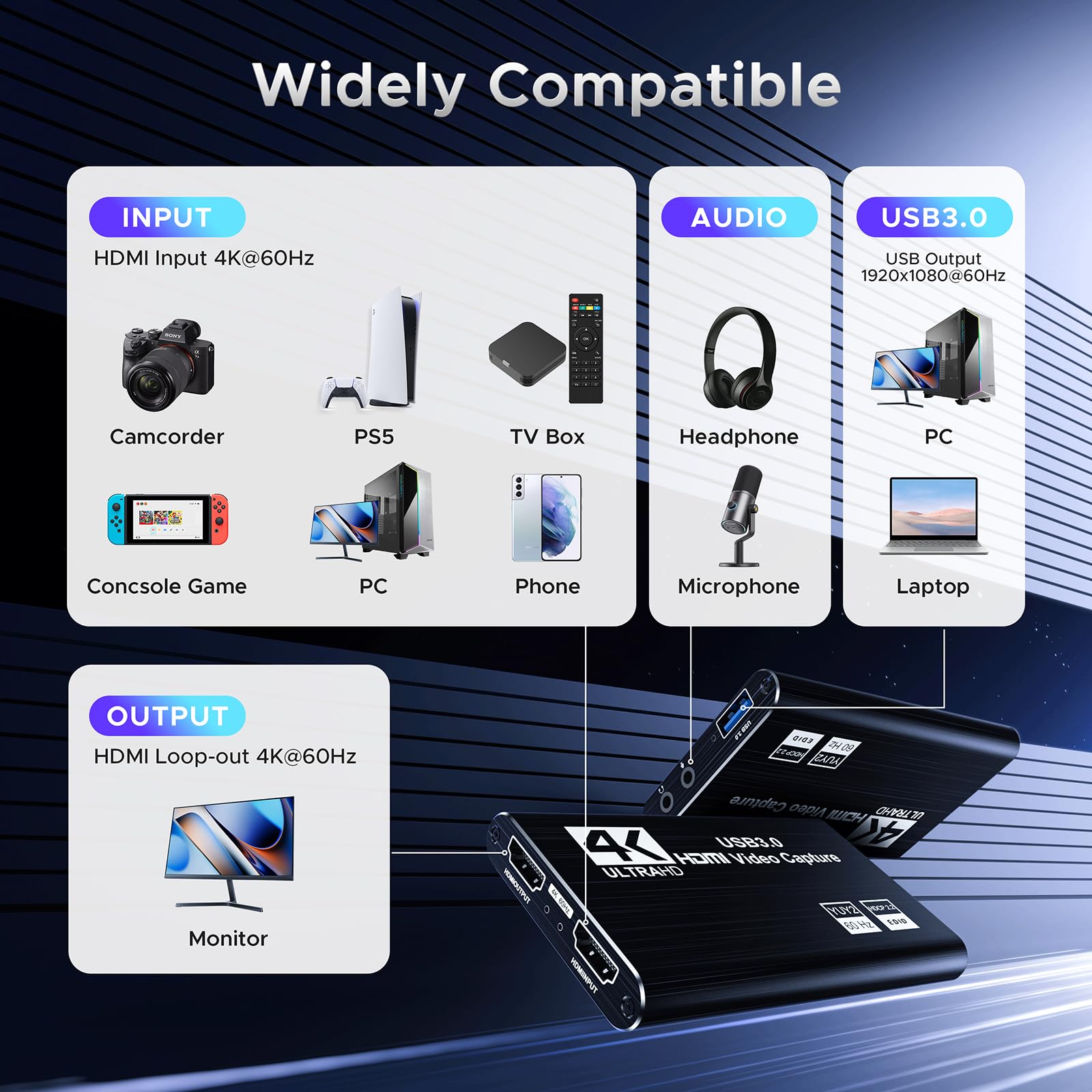 "【Wide Compatibility】 Easily streams to Facebook, Youtube or Twitch. With the connection, this HDMI to USB C/3.0 video capture devices can be working on several Operating Systems and various software: Windows 7/ 8/ 10, Mac OS or above, Linux, Android, Laptop, PS3/PS4/PS5, Camera, Webcame, DSLR, Switch, Steam, TV BOX, HDTV, Potplayer/VLC, ZOOM, OBS Studio etc",
