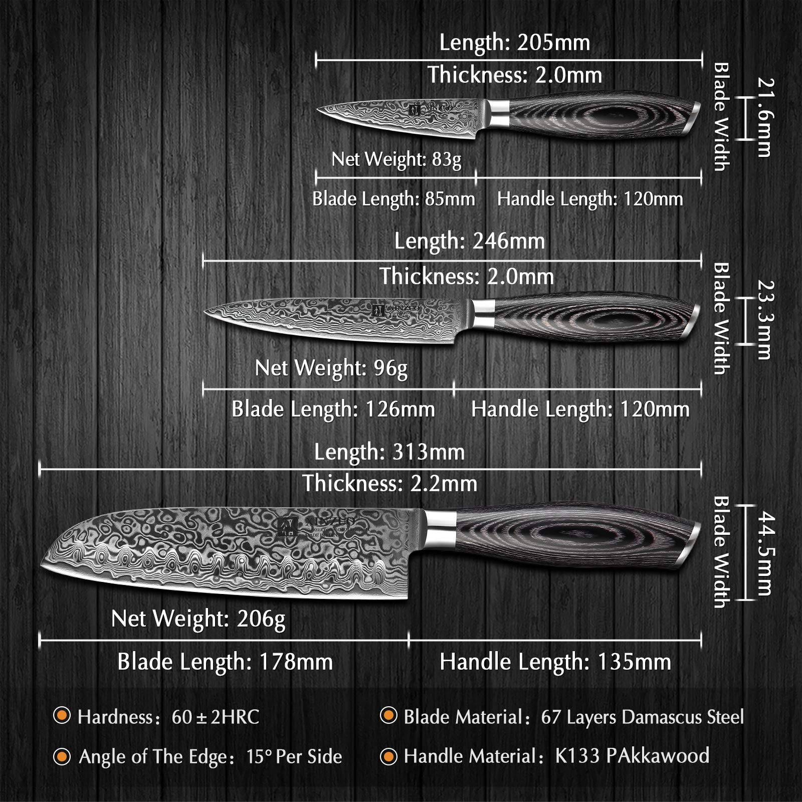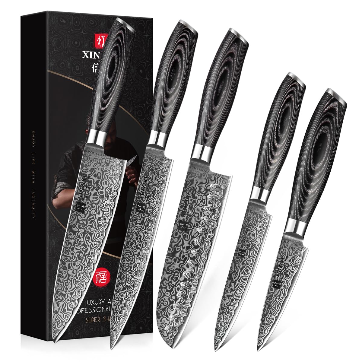 ["High-quality Damascus Steel" Made of high-quality 67-layer 10Cr15CoMoV Damascus steel, vacuum heat treatment, hardness up to 62 HRC. It also has the properties of corrosion resistance, rust protection, and strong toughness. The unique wave pattern of Damascus showcases impressive craftsmanship and artistic personality., "Ergonomically Designed Handle" The ergonomic handle design ensures a comfortable grip and provides the best maneuverability to effortlessly cut through all foods. Made of Pakkawood, which is not easily deformed and cracked, seamlessly fitting into the hand, making cutting easier and safer., "Perfectly Sharp Blade" With excellent materials and strict technology, with 10Cr core, the blade is very sharp and strong. Razor-sharp blades can last for months even in daily use. The cutting angle is 15 degrees, and with its excellent sharpness, you can easily slice meat and vegetables into thin pieces., "The Pursuit of Perfection" Our craftsmen use the strictest work procedures to carefully craft each knife within a 65-day production cycle. Stringent tests ensure that the kitchen knives feel weighted and balanced. The result is a perfect blend of control and durability that won't tire you even after hours of use., "Brand XINZUO" XINZUO kitchen knife is an ideal choice for professional chefs and cooking enthusiasts, beginners. Comes with a beautiful gift box, perfect for gifting during holidays or for daily use. If for any reason you are not satisfied with the product, please contact our customer service and we will solve your problem as soon as possible."]