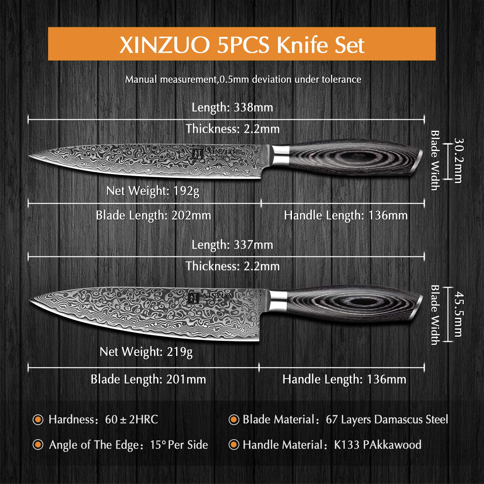 XINZUO 5 Piece Kitchen Knife Set 67 Layers Damascus Steel Chef Knife Set, Professional Forged Damascus Knife Set Sharp Blade Cooking Knife Set - Chef Santoku Slicing Utility Fruit Knife - PakkaWood Handle