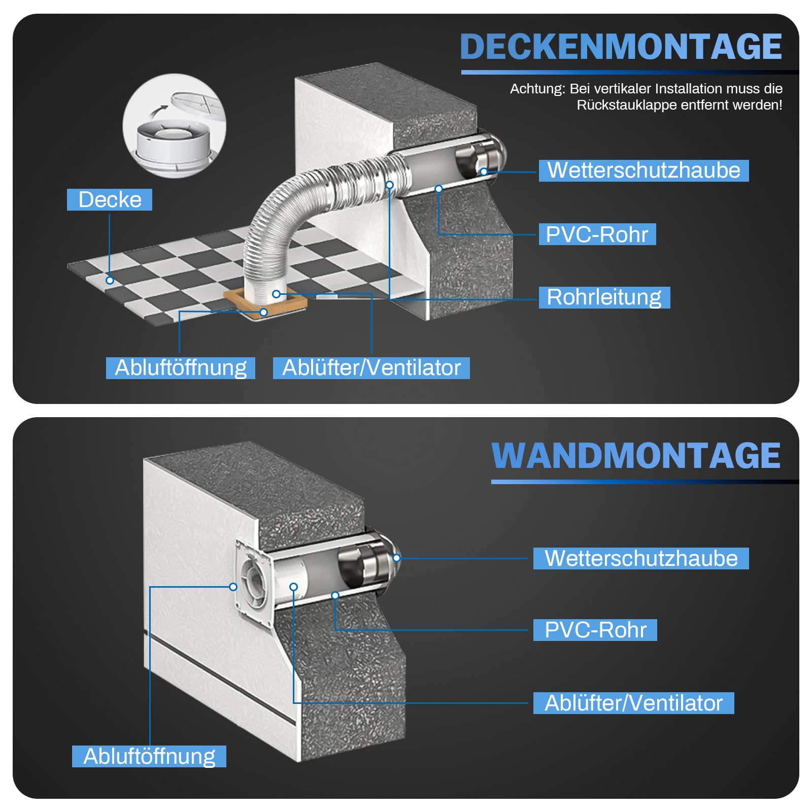 ["High-performance ventilation Our bathroom fan features a copper motor with double ball bearings to reduce friction, as well as an integrated overheat protection, saving energy and reducing noise.","Backdraft damper The fan features a backdraft damper to prevent insects from entering the house. At the same time, the backdraft damper ensures that no cold or humid air from outside enters the room through the fan.","Technical specifications Applicable pipe diameter: 100 mm; Power: 12 W; Voltage: AC 110 V - 240 V; Frequency: 50 Hz - 60 Hz; Noise level: 34 dB; Air flow: 95 m³/h; Fan speed: 2200 RPM; Waterproofing: IPX2","Wide applicability This 100 mm fan is ideal for bathrooms, toilets, kitchens, living rooms, offices, basements, warehouses, garages, and other areas in need of ventilation.","Easy installation Our fan can be directly attached to glass or a wall with adhesive. However, if you want to mount it on the ceiling, we recommend removing the front panel and securing it with screws for greater stability. The 100 mm bathroom fan comes with a 3-meter Euro plug cable and has a built-in switch, so no additional wiring is required. [Please note: The power cord must be connected by yourself]"]
