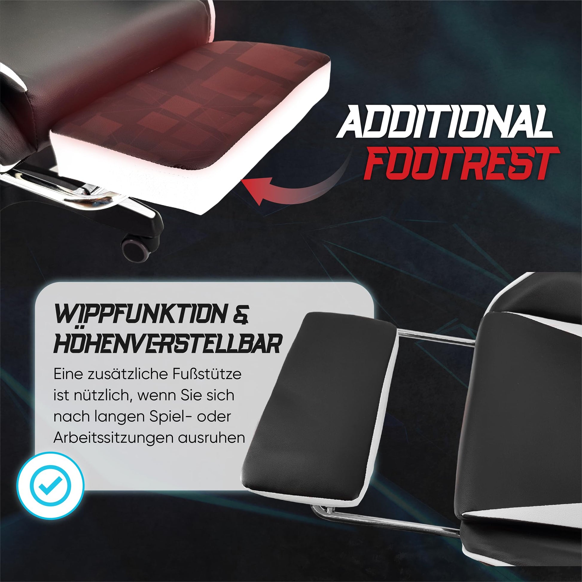 ["✅ Ergonomically shaped gaming chair and office chair with high-density foam, adjustable headrest cushion and lumbar cushion for maximum comfort and support. Ideal for long gaming or work sessions.","✅ 360-degree swivel seat with quiet, high-quality wheels for smooth maneuvering, capacity up to 286 lbs and tilt function from 90 to 130 degrees with continuous angle lock.","✅ High-quality legs ensure stability and durability. Abrasion-resistant eco-leather is easy to clean and provides maximum comfort. Integrated footrest for relaxation after long sessions - be it intense gaming, extensive work at the desk or cozy internet surfing.","✅ Easy assembly with detailed instructions and all necessary parts. Assembly tools are included, quick and effortless setup in just 15 minutes.","✅ Product dimensions: Length (37-45 in) x Width (27 in) x Height (49-52 in). Seat height adjustable from 17 to 20 in. High backrest provides additional comfort and support. Perfect as a gaming chair, task chair or office chair."]