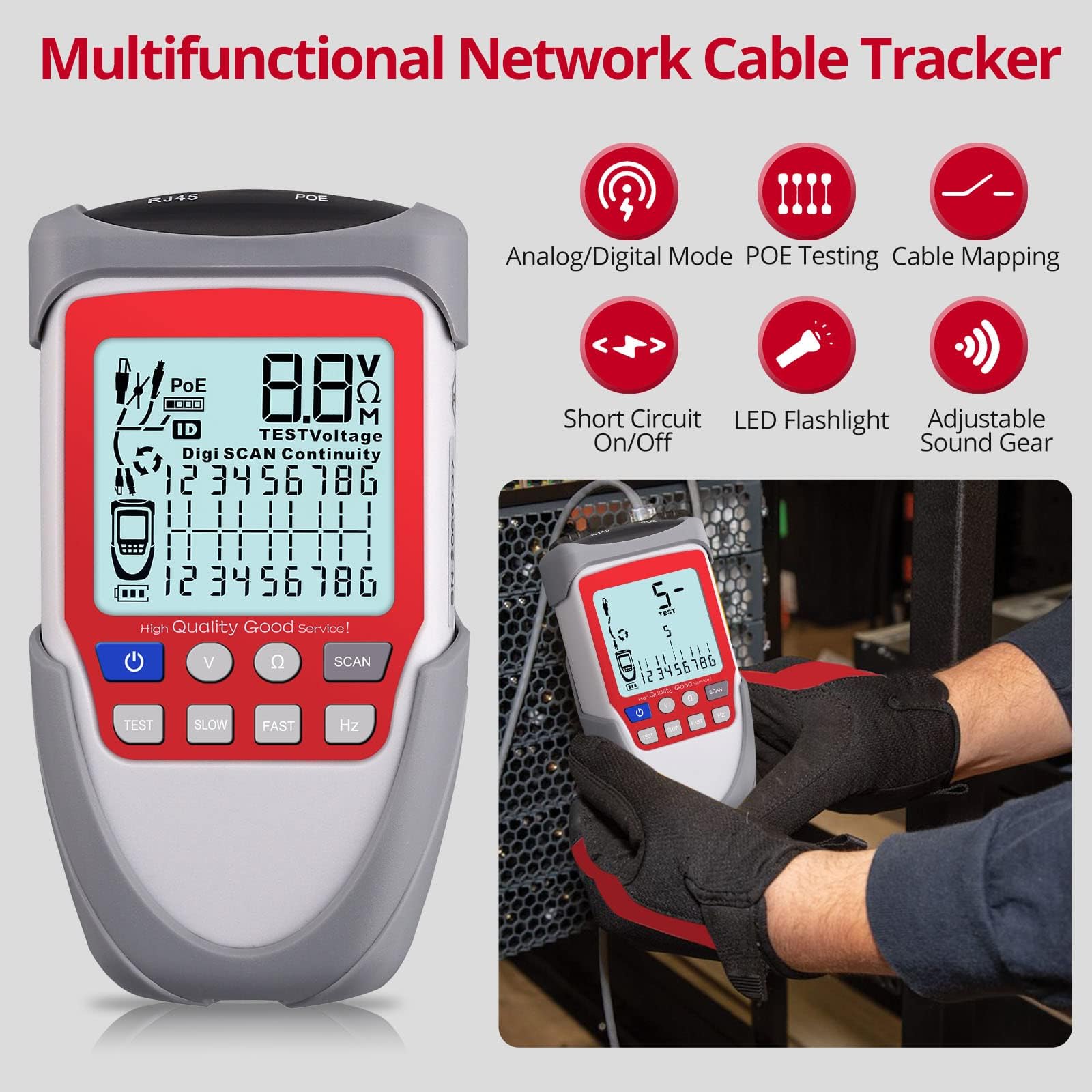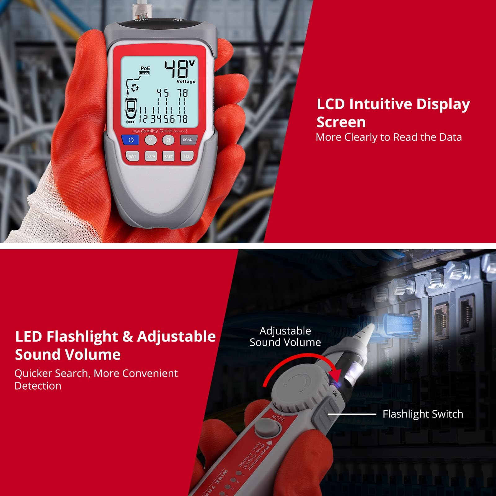["Wire Tracking - It can quickly find the required pairs of wires among many. It is adaptable to the RJ45 terminal of the network cable and the POE terminal of the telephone line. It can test other metal wires through an adapter. Adjustable sensitivity.", "LCD Screen - Adopt the intuitive LCD screen so you can see the data more clearly, and with three modes that you can freely switch between: POE mode, digital mode, and analog mode. The LED flashlight function can be used normally in a dark environment", "POE Test Function - This tool can be used to test standard and non-standard POE devices, it can also test the POE voltage, power supply polarity, and power supply mode.", "Network Cable Collation-- It tests the physical connection status of network cables, such as interruption, short circuit, miswiring, and reverse connection. Use the transmitter only to test the status of working telephone lines.", "Voltage Test Function - You can click on \"V\" to access the voltage test function, which can measure battery voltage and voltage polarity, and you can press \"V\" again to enter the POE test mode. You can measure the line and voltage of the POE power supply. And can be traced in the presence of voltage. (less than 60 V)"]