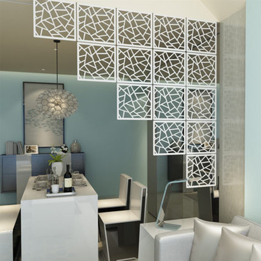["Size: 29 x 29 cm, Thickness: 0.5 cm (per panel), 12 pieces can cover 1 sqm (10.7 sqft)", "Material: eco-friendly wood-plastic board, lightweight, waterproof, and washable.", "Easy to install: This room divider package comes with screw sleeves, screws, and connecting rings. You just need a few of your own tools and installation to complete it.", "Versatile: This room divider can be used in restaurants, offices, bars, hotels, or at home in rooms such as living rooms, bedrooms, and studies. Provides enough light and mystery while protecting your privacy.", "Package includes: 12 x hanging panels, some screw sleeves, screws, and connecting rings."]