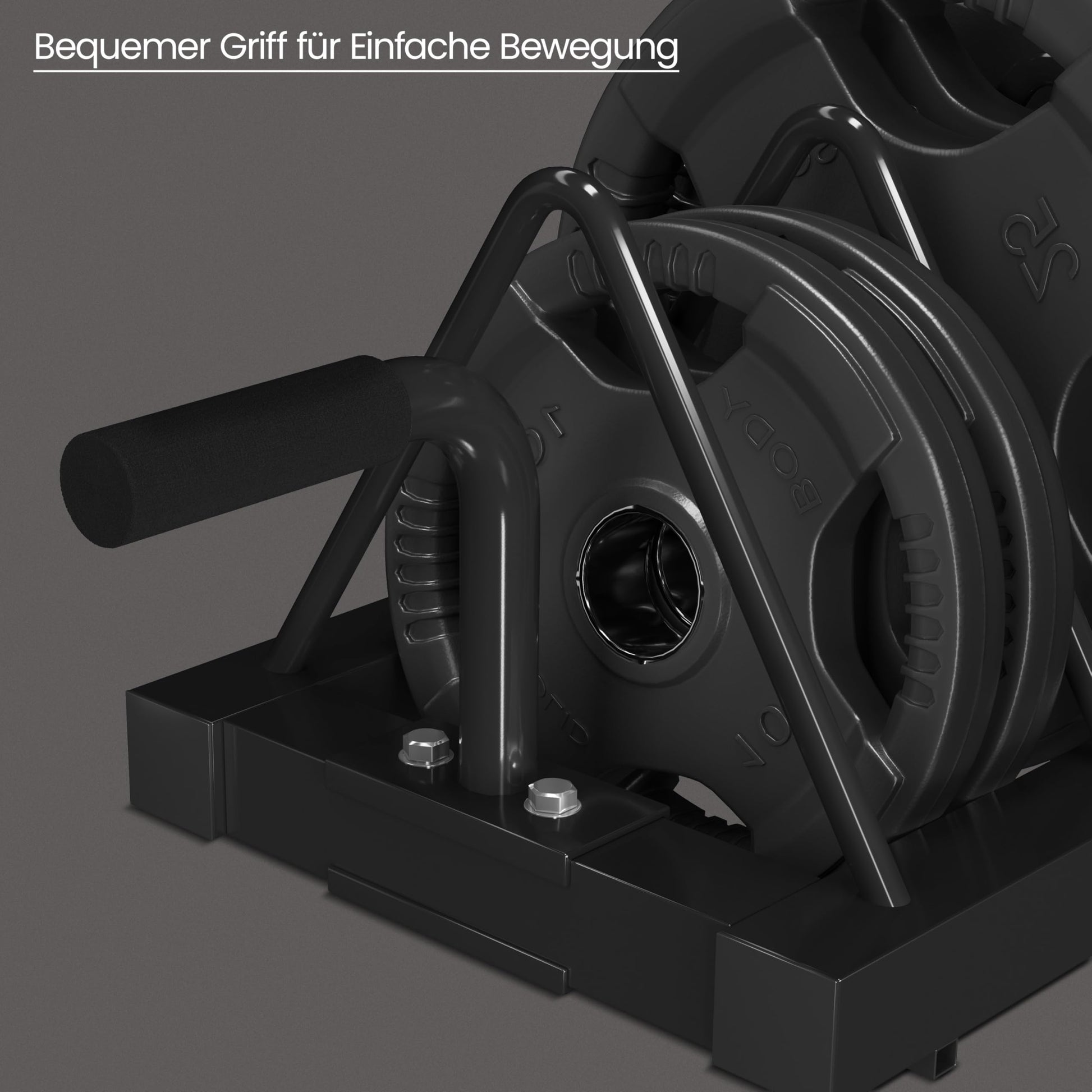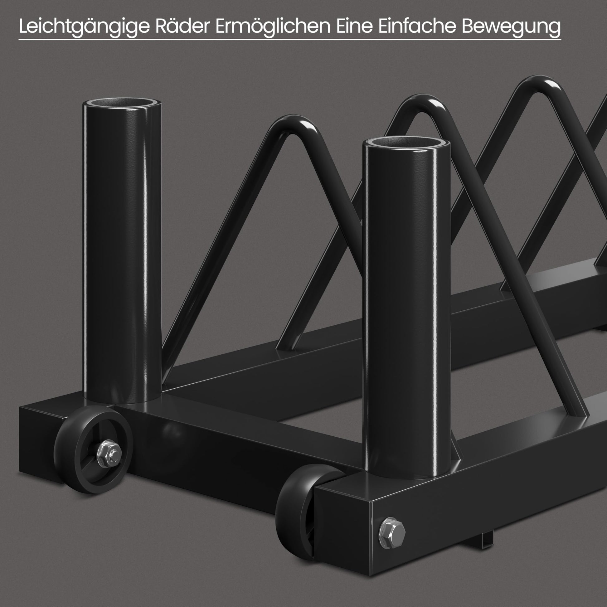 Flexible & mobile - This weight plate rack is equipped with 2 wheels with a diameter of 6.5 cm on one side. On the other side, there is a handle. The design makes it easy to move.