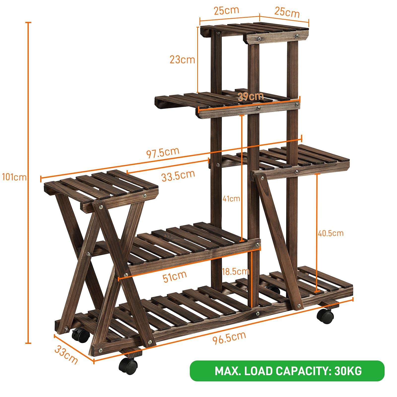 ["Versatile and Multifunctional: Our plant stand with dimensions of 97.5 x 33 x 101 cm (L x W x H) is ideal for use in various places such as the living room, bedroom, balcony, or garden. It is also perfect for use in the office, restaurant, or café where you can create a special atmosphere with a little green vegetation.","Carbonized Fir Wood: Thanks to carbonization, the wood cells are compacted and the wood is protected from weathering, mold, rot, and water. This process makes the wood particularly durable and weather-resistant. Ideal for long-lasting use in the garden or on the balcony.","Flexible and Mobile: Our plant stand is equipped with four 360° freely rotating wheels. This allows you to move this flower rack as desired and change the position at any time. Two wheels with brakes ensure that you can lock the plant stand in place once you have chosen a suitable position, ensuring a secure setup.","Classic Appearance: Our plant stand has a classic and neutral color, allowing it to blend seamlessly into your existing room concept and provide an elegant charm in your room or garden.","WEATHER RESISTANT: Thanks to a water-repellent coating, our plant stand is easy and quick to clean. It also protects the surface from minor scratches. Our garden shelf is designed so that only minimal maintenance is required even with long-term use."]