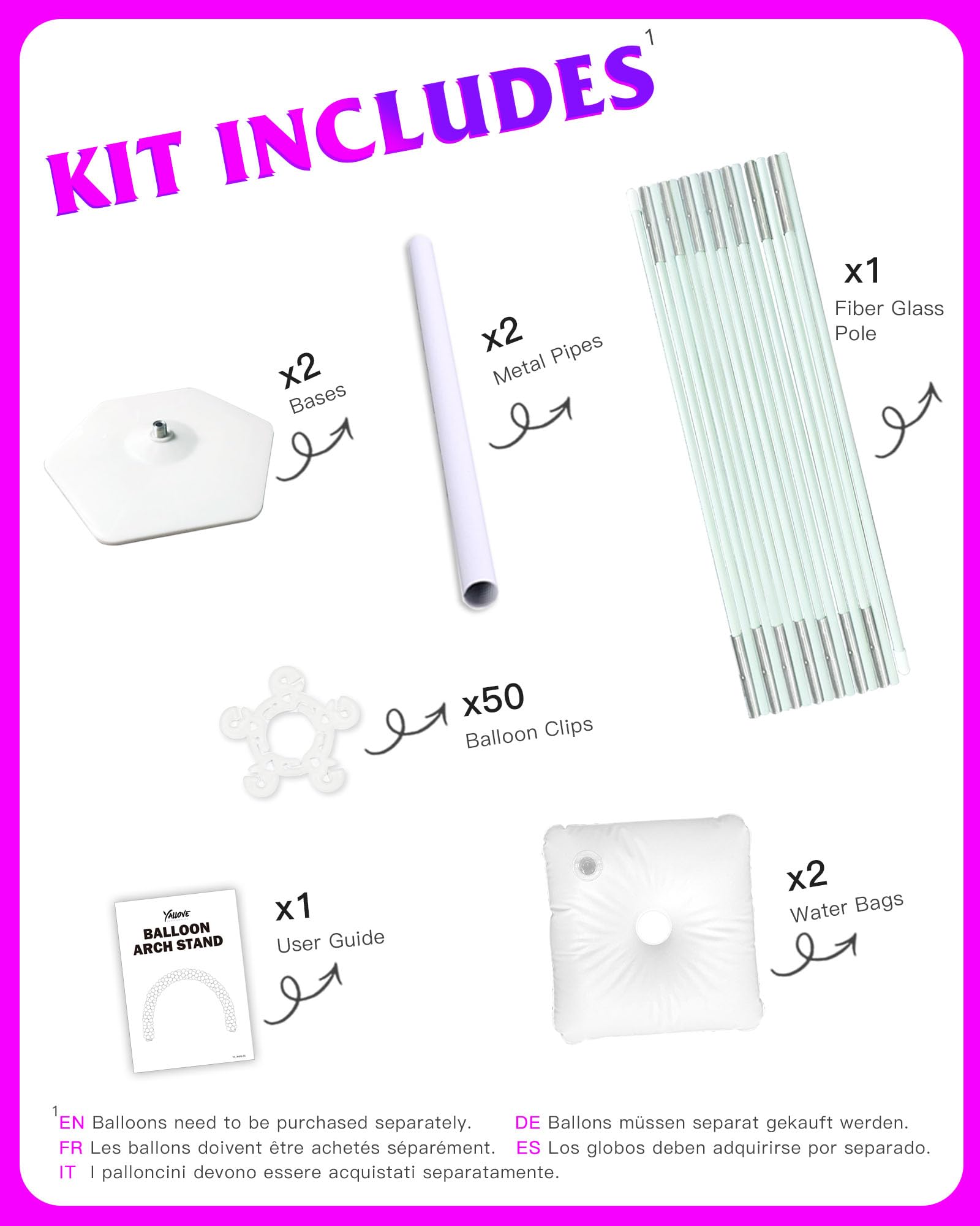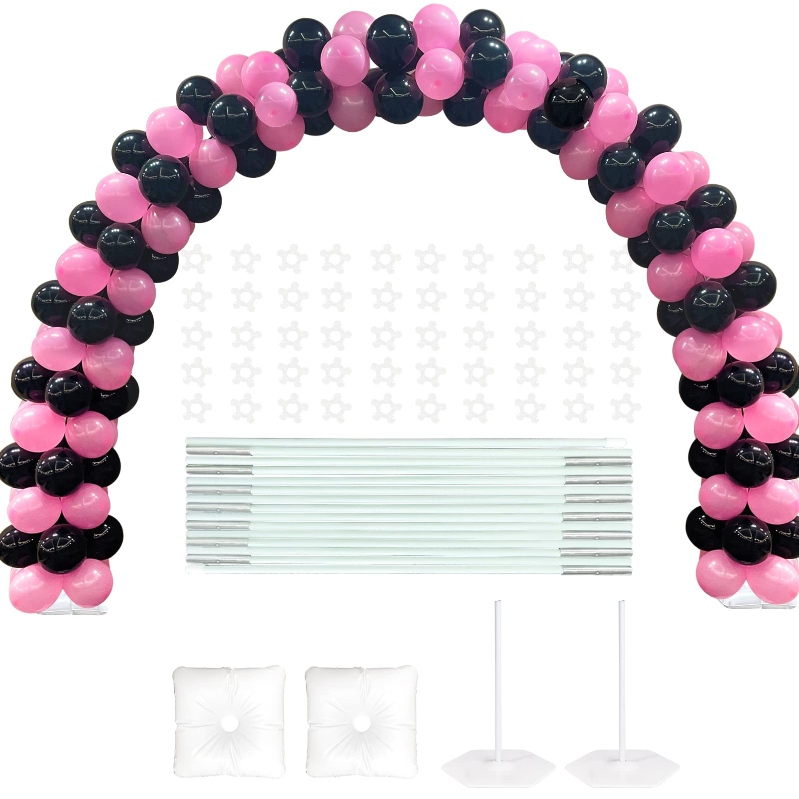 ["NEW VERSION: With the newly redesigned base, you can adjust the arch more comfortably, and the stronger ground anchor set makes the balloon arch more stable outdoors","EASY ASSEMBLY AND DISASSEMBLY: Following the included assembly instructions, the assembly and disassembly process is like a breeze","ADJUSTABLE: The arch of the balloon stand is 21 ft long and its width and height can be freely adjusted to your needs. 3 typical sizes are shown in the product images","PORTABLE: The arch is made up of 15 flexible plastic rods, each 16 inches long, it is small and light, easy to store and transport","WHAT DO YOU NEED TO PREPARE? It is recommended to prepare an electric balloon pump and 130-160 pieces of each type of balloon, then you can start building your balloon garland"]