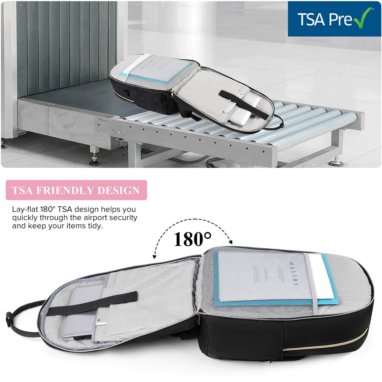 "【TSA Design And Luggage Strap】TSA-friendly backpack can be easily scanned by a security machine.Unfold the school backpack at the checkpoint freely by 90-180 degrees and the laptop remains flat, without removing it from the backpack, making it more efficient through security control.The luggage strap on the back can easily slide over the luggage tube and attach to your rolling luggage to make transportation easier.",