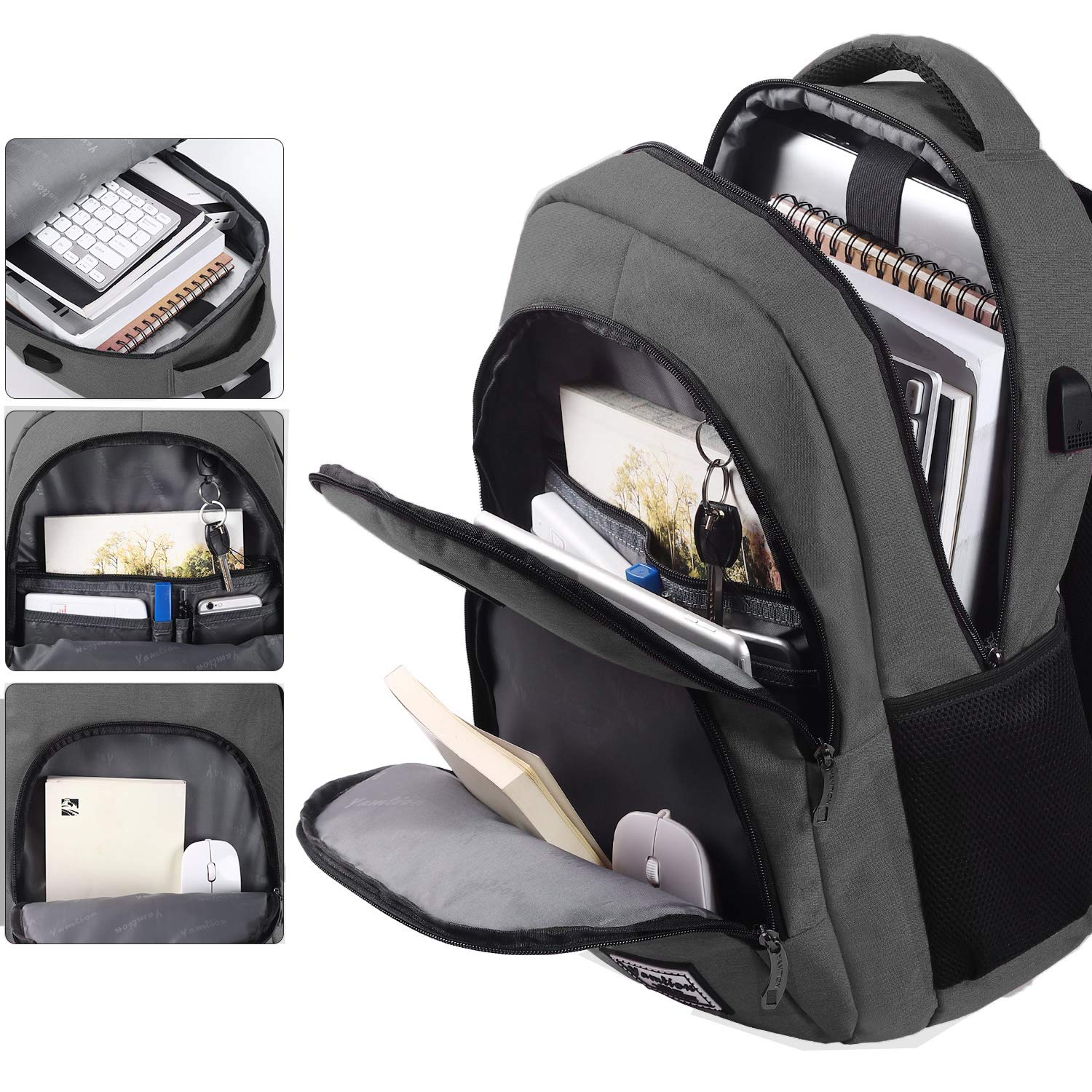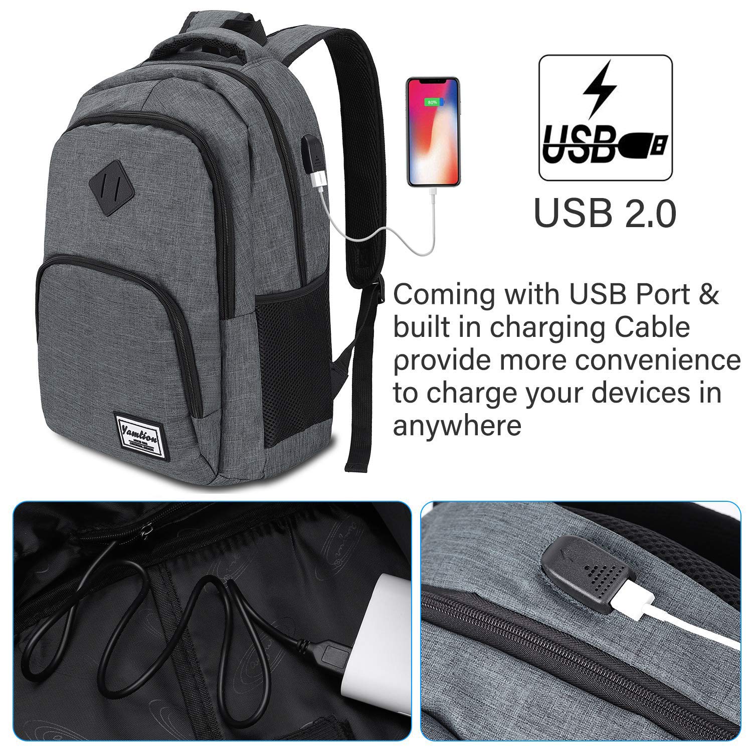 ["【Large Capacity】3 independent compartments, 11 storage pockets, 35L capacity. Backpack with laptop compartment suitable for 15.6-inch laptop as well as 15-inch, 14-inch, and 13-inch Macbook, laptop, or notebook.","【Water-resistant Fabric】The backpack is made of high-quality, water-resistant coated 600D Oxford fabric. Light rain is no problem for this premium backpack.","【USB Port】With the built-in external USB charger and integrated charging cable inside, this USB backpack provides a convenient way to charge your smartphone while carrying it.","【Breathable and Comfortable】Extremely high wearing comfort thanks to thick, yet soft multi-panel ventilated padding. The ergonomic, breathable, and adjustable shoulder straps relieve the stress on the shoulders even during long periods of carrying. Say goodbye to old school bags and treat your body with something good.","【Versatile】The laptop backpack with USB port and laptop compartment is ideal for daily use. Whether in school, college, vocational school, shopping, or traveling. Suitable for both men and women due to its stylish design."]