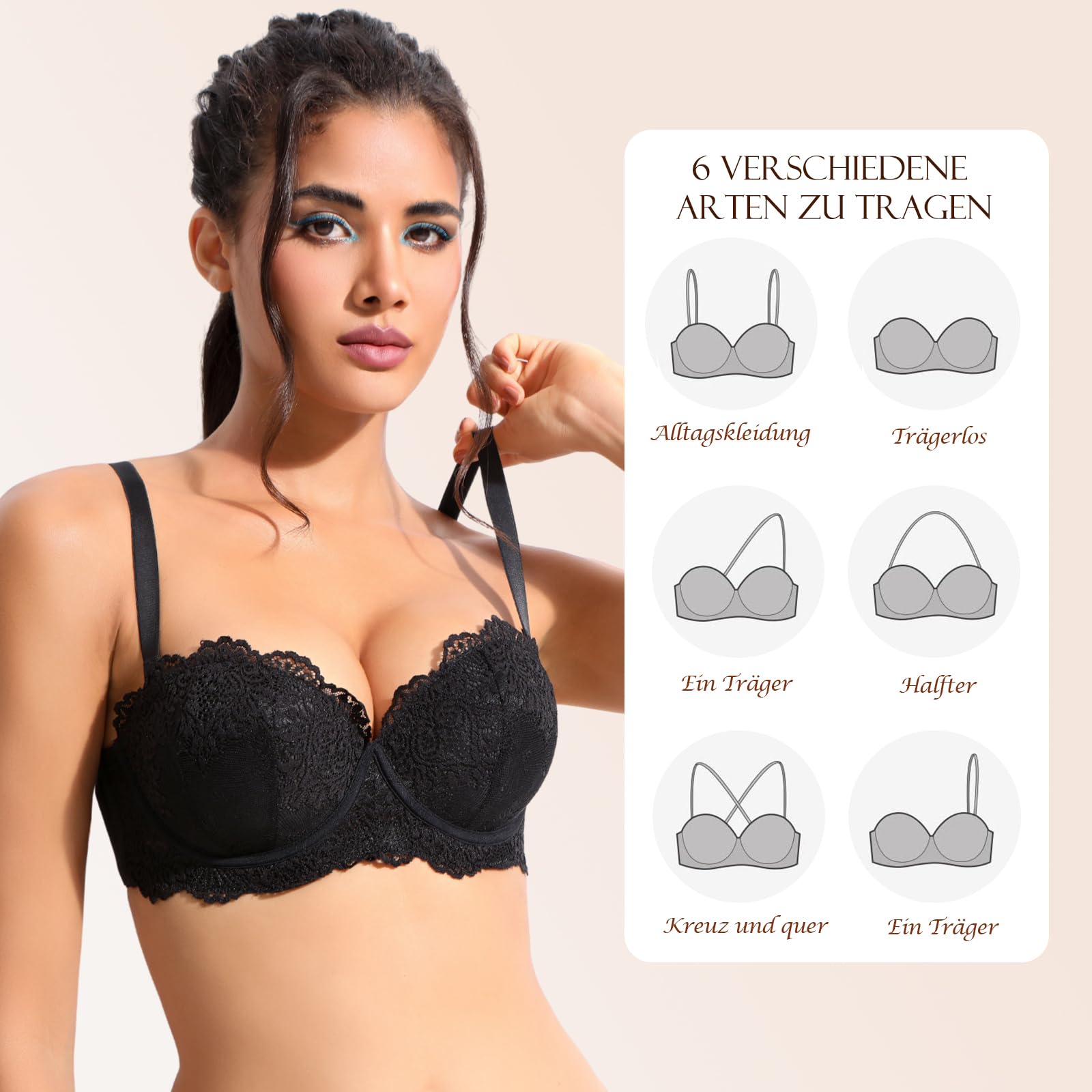 ["Multiway Strapless Bra: Comes with fully adjustable and removable straps (clear straps and color-coordinated straps) that can be converted into different styles such as strapless, crisscross, halter, one-shoulder, traditional.","Strapless Push-up Bra: Thickly padded, molded cups with underwire provide moderate support and give a natural shape. Hand wash to maintain the original shape.","Cup with floral lace: Floral lace covers the entire cup with a unique scallop shape for a wonderfully romantic touch. Gives you a touch of femininity and charm.","Every Occasion: This strapless balconette bra can be worn not only in daily life, but is also perfect for evening gowns, weddings, proms, parties, gatherings, etc., best suited for your prom or off-the-shoulder dress.","Non-slip Balconette Bra: With non-slip fabric material support along the band edge to keep it in place and provide non-slip comfort for wearing all day."]