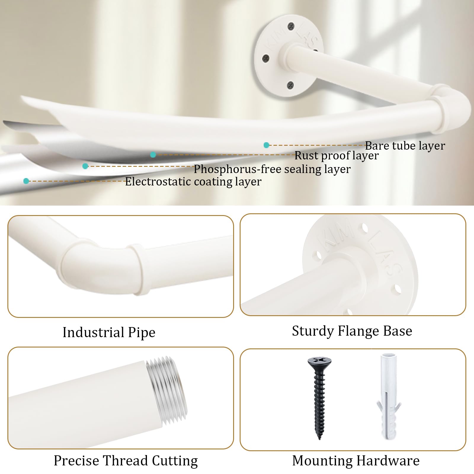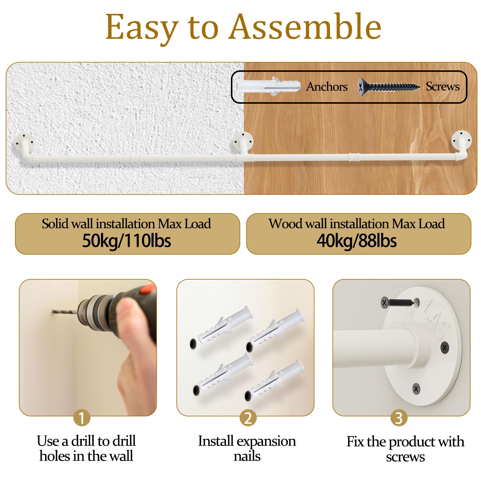 "Easy Installation: This item includes all mounting hardware for installation on concrete/tile walls or other wall types. The installation of the wall-mounted pipe suspension rack is super easy and quick, instructions included in the package"