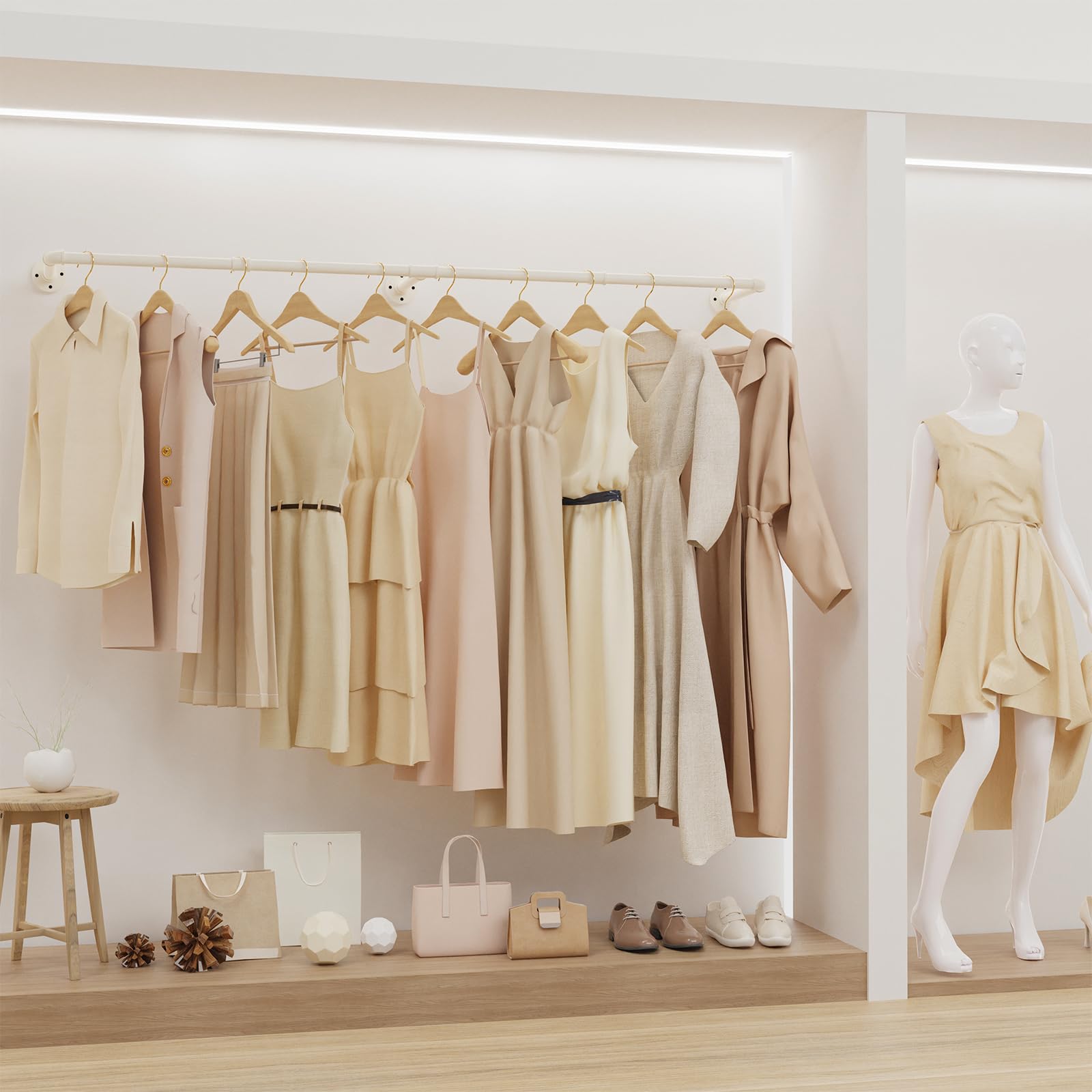 Yawinhe industrial pipe clothing racks, 180cm wall-mounted clothes hangers, space-saving wall shelf kitchen rack with 3 bases, for business, cream color, 2-pack, YMG004W-2.