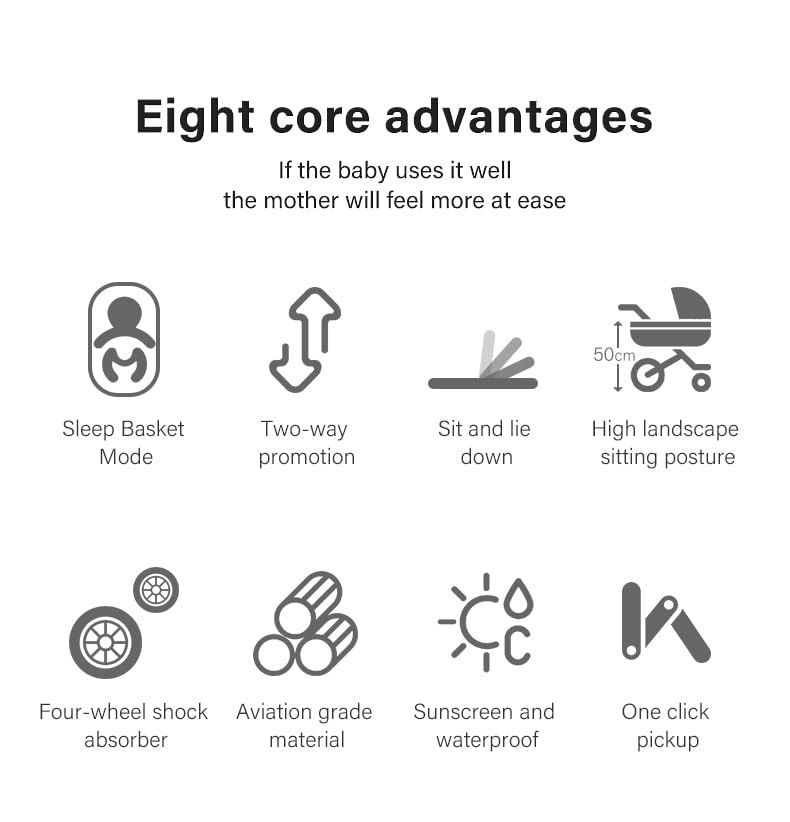 ["Safety and Comfort"] Stroller is typically equipped with a 5-point harness system and an adjustable safety bar to keep the baby safe and comfortable, adjustable canopy that protects the baby from sun, wind, and rain,