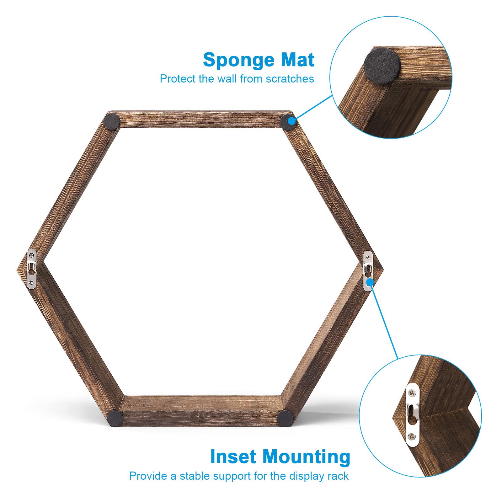 ["FLOATING SHELVES 6-PACK - Hexagonal floating shelves make good use of empty wall space and give your home a warm and exquisite wall look. The floating shelf design adds a farmhouse look to any room, and this wooden hanging shelf is perfect for plant display or collectibles. Our hexagonal shelf set is perfect for bedrooms, offices, hallways, or living rooms", "FUNCTIONAL STORAGE SHELVES - Set of 6 modern hexagonal wall shelves provide plenty of storage space and showcase your photos, plants, small art ornaments, calendars, alarm clocks, magazines, etc. Or as a display stand for hanging on the wall in the channel or hallway, showcasing all kinds of exquisite ornaments, friends will praise such a magazine cover like an exhibition shelf", "DIY HOME DECORATION - These wall shelves can be used separately in different rooms or in groups. Use multiple sets to create eye-catching patterns. These honeycomb wall shelves are also a great choice for decorating coffee corners. Use brown floating hexagonal wall shelves to create your own unique shape and instantly beautify your home", "THICKER WOOD STRUCTURE - Our honeycomb wall shelf is made of sturdy and thick Paulownia wood. Each hexagonal floating shelf set is made of sustainable, eco-friendly Paulownia wood. Lightweight and durable, each shelf retains the original wood grain, making each hexagonal wood shelf unique! In addition, our geometric storage shelves are completely biodegradable and recyclable", "INSET WALL MOUNTED DESIGN - Super easy, no installation requirements! Simply screw the screws into the wall holes and insert the honeycomb wall shelf for farmhouse storage to complete the installation! Delight your family and friends with stunning honeycomb decor"]