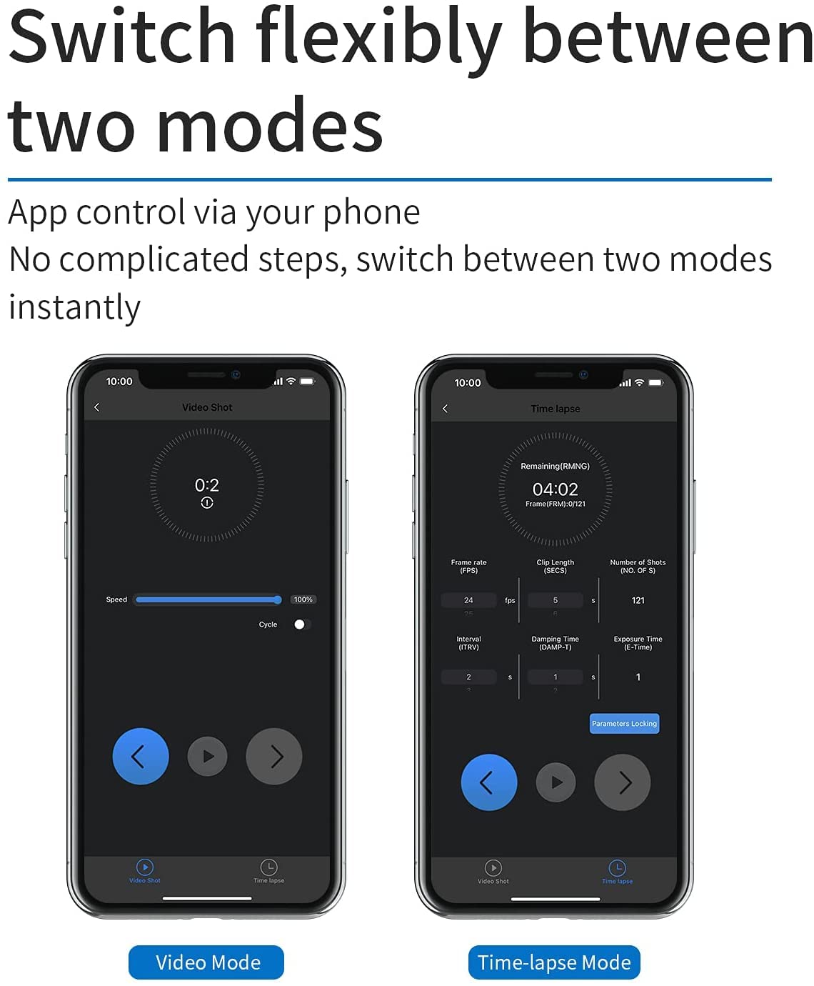 【Video Mode & Time-lapse Photography】Video mode: Set A-B points, automatic rotation; Time-lapse photography: Automatic rotation, you can set the number of images, speed, interval, and number of photos. Control the recording time effectively by adjusting the running speed. Forward and reverse movements can combine the virtual and real effect of the lens aperture.