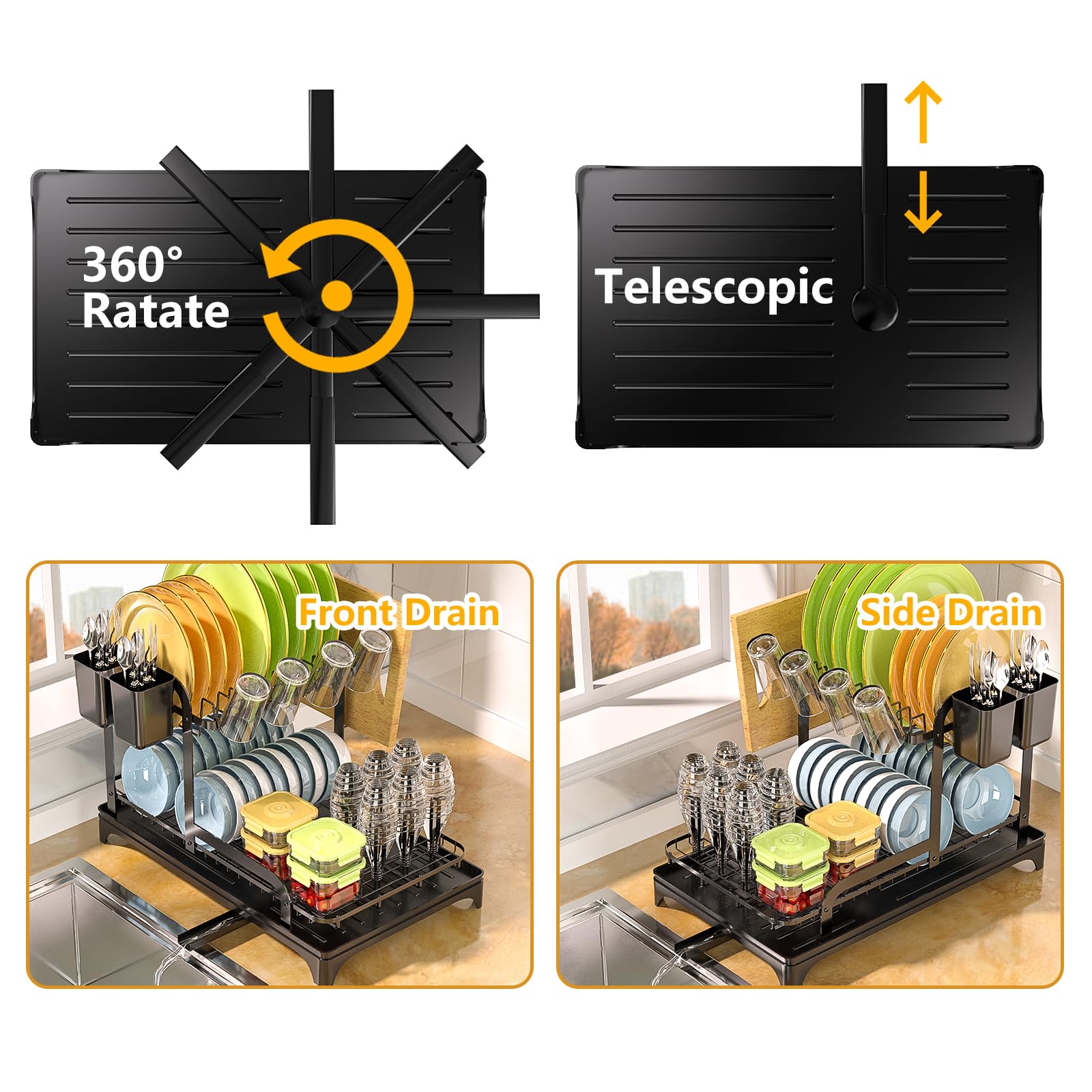 "Storage and drainage in one: If you are still worried about messy dishes, I recommend this double draining rack. It can neatly organize your clean bowls, plates, cups, soda bottles, and other dishes and let the water drain. Equipped with a knife and fork holder, you can organize your fork, spoon, etc. to provide you with a clean and tidy kitchen! Sturdy and robust, not easy to rust: This dish rack is made of high-quality steel, the overall structure is solid, the double-layer structure enlarges the storage space, the steel surface is sprayed with a layer of food-grade black rust-resistant coating, even if your dish rack is exposed to a damp environment for a long time, it will not rust easily. 360-degree rotatable drainage pipe: Our dish rack is equipped with a drain tray with an extendable pipe to prevent water from running onto your countertop. The pipe is also 360 degrees rotatable, so the water can drain easily no matter at what angle you place it in your kitchen. Easy to install: The size of this dish rack is 42 x 32 x 30 cm, the installation is very simple, according to the manual guidelines, insert the respective position of the screws, no need to finish the assembly in 5 minutes. Lifetime quality guarantee: We offer a lifetime product guarantee to every consumer. If you receive a product with quality problems during use, please contact us immediately and we will offer you the best solution as soon as possible!"