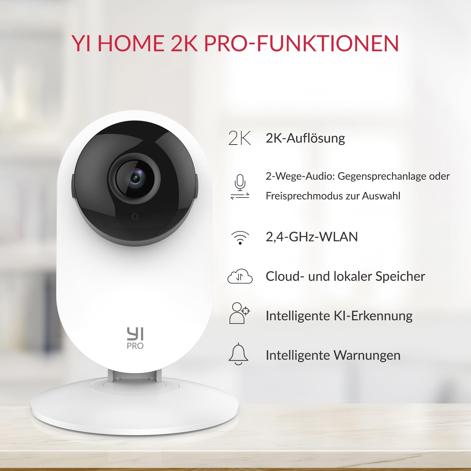 ["2K Crystal Clear Recordings: YI Home Pro 2K Full HD high resolution, built-in infrared LEDs capture clear and detailed images for all specific activity areas, whether day or night.","Enhanced Peace of Mind: 24/7 monitoring services, precise built-in AI helps detect motions and send instant push notifications to keep you informed of what's happening at home anytime, even when you're not there.","Two-Way Audio: Allows you to receive and transmit audio from any location with Wi-Fi connection. The YI Home camera supports both intercom mode (only one can speak) and hands-free mode (both can speak simultaneously).","Reliable Wi-Fi Connection: Access your camera anytime, anywhere on a mobile phone with YI Home App. The indoor surveillance camera works with 2.4 GHz Wi-Fi. (5 GHz is currently not supported).","Advanced Data Privacy & Security: Store all recorded videos up to 30 days in the cloud (subscription required). Secure data transfer via EU servers with end-to-end encryption. Optional PIN code for secure access to live stream and settings."]