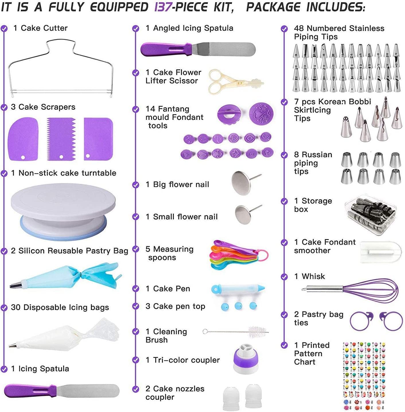 ["137-piece baking set: 1 cookie cutter, 3 cake scrapers, 1 non-stick turntable, 2 reusable silicone pastry bags, 30 icing bags, 2 angled icing spatulas, 1 cake flower scissor, 14 fondant tools, 1 large nail flower, 1 small flower, 5 measuring spoons. 1 cake pen. Cake plate, 3 cake tips, 1 color coupler, 2 cake nozzle couplers, 48 icing tips","Healthy Materials】 Piping tips and cake spatulas are made of FDA-approved 304 steel, which does not easily deform. Cake scrapers and cake turntable are made of food-grade ABS plastic, which is easy to clean and dishwasher safe. The silicone piping bags, cupcake mold, and decorating syringe are made of silicone.","Non-Slip Design】 The turntable rotates smoothly with hidden ball bearings, helping you to easily decorate cakes for birthdays, weddings, and other events. It rotates clockwise and counterclockwise, perfect for right-handed and left-handed people. Use the straight spatula to smooth the icing on round cakes on the sides and the angled spatula on top while turning the turntable.","Great Gift】 With a rich assortment of accessories, whether decorating birthday cakes, cupcakes, cake pastries, cookies, it is your ideal baking tool. It is easy and simple to use, and can decorate delicious desserts without experience. Whether as a gift for children or friends, or as a gift for yourself, you will love this 106-piece decoration set.","Theme Board and E-Book】 This cake decorating set is fun at any age or skill level, this set has numbered tips with a diagram. So you don't have to worry about tricks and their impact on the type of decoration, just take a look at the diagram where the result of each trick is displayed to make your choice."]