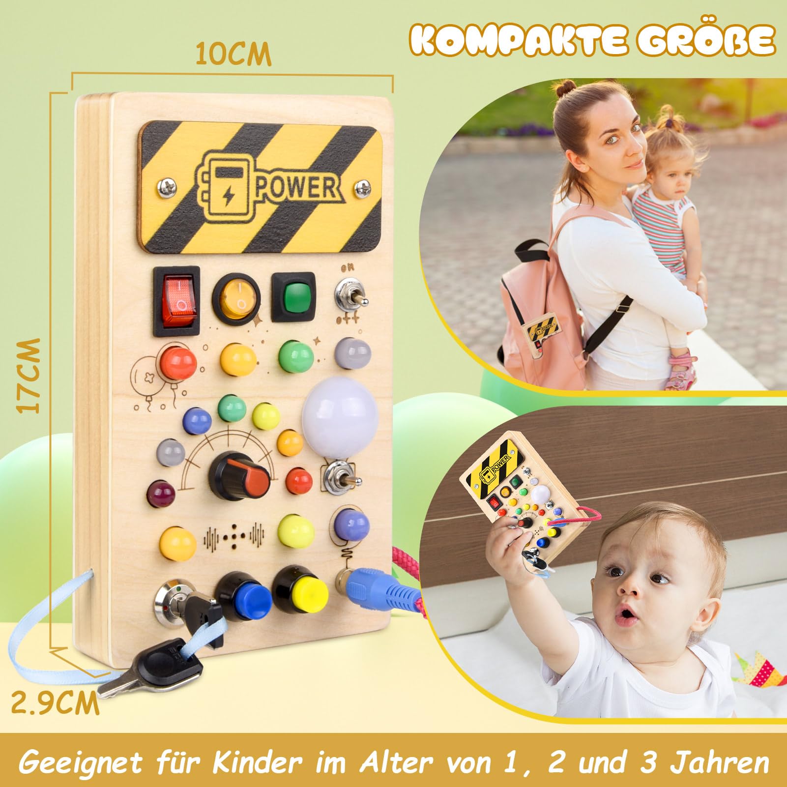 YIKANWEN Montessori Busy Board Toy for 1 2 3 Year olds, wooden toy with music and 10 LED light switch sensory learning toy for babies toddlers boys girls aged 1 2 3 4 years