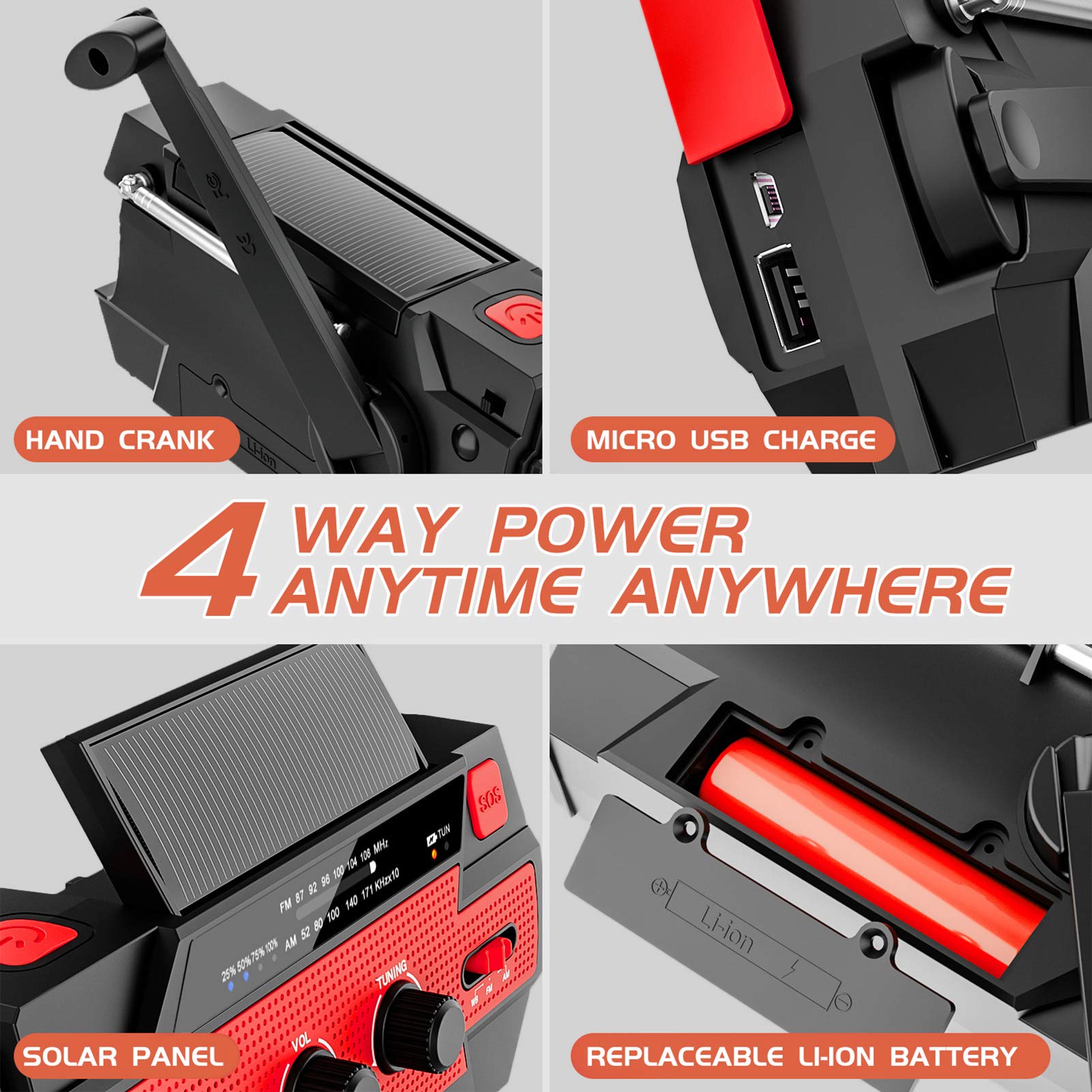 YIKANWEN Solar Radio, AM/FM Crank Radio Portable USB Emergency Radio with 4000mAh Rechargeable Battery and Hand Crank Dynamo for Camping, Travel (Red)