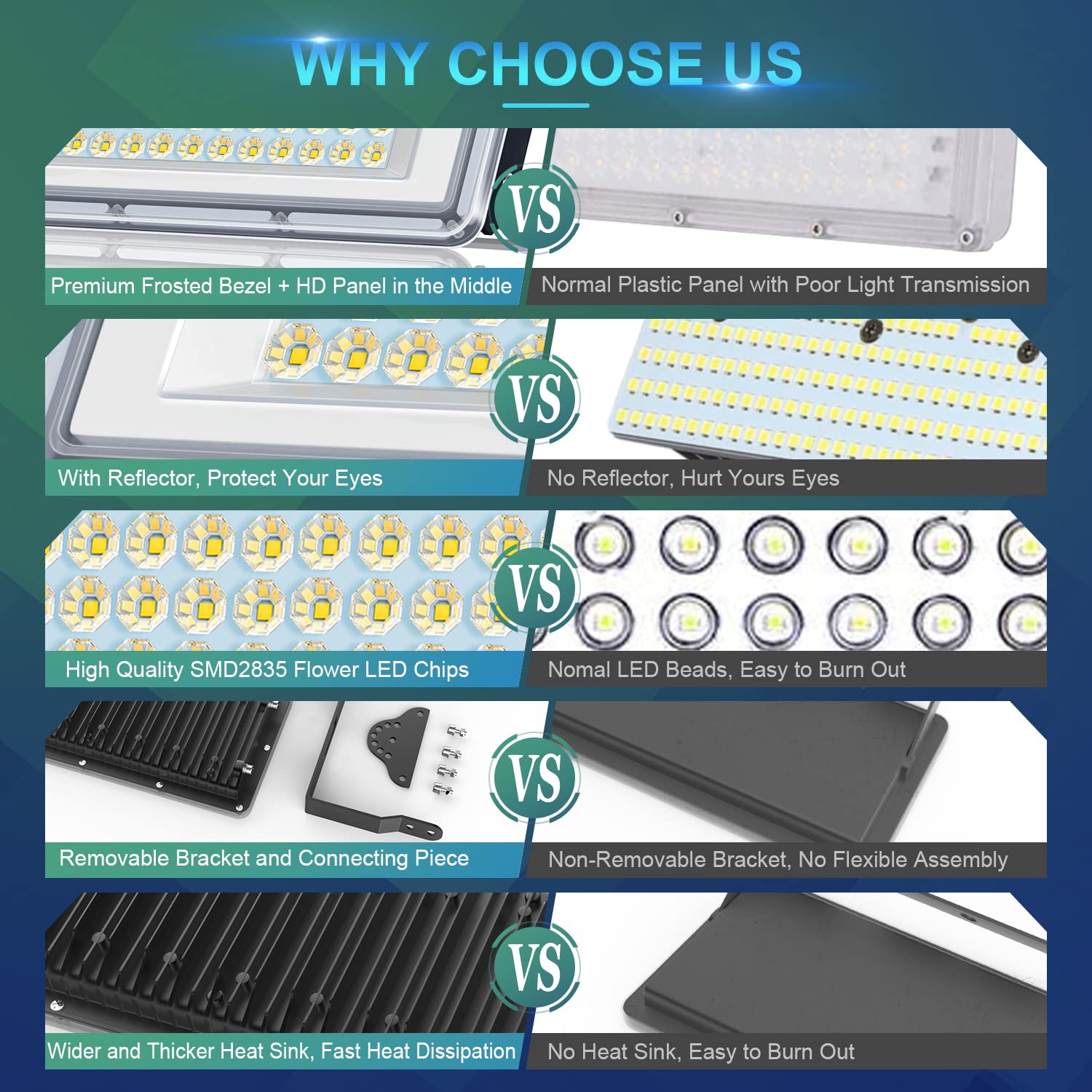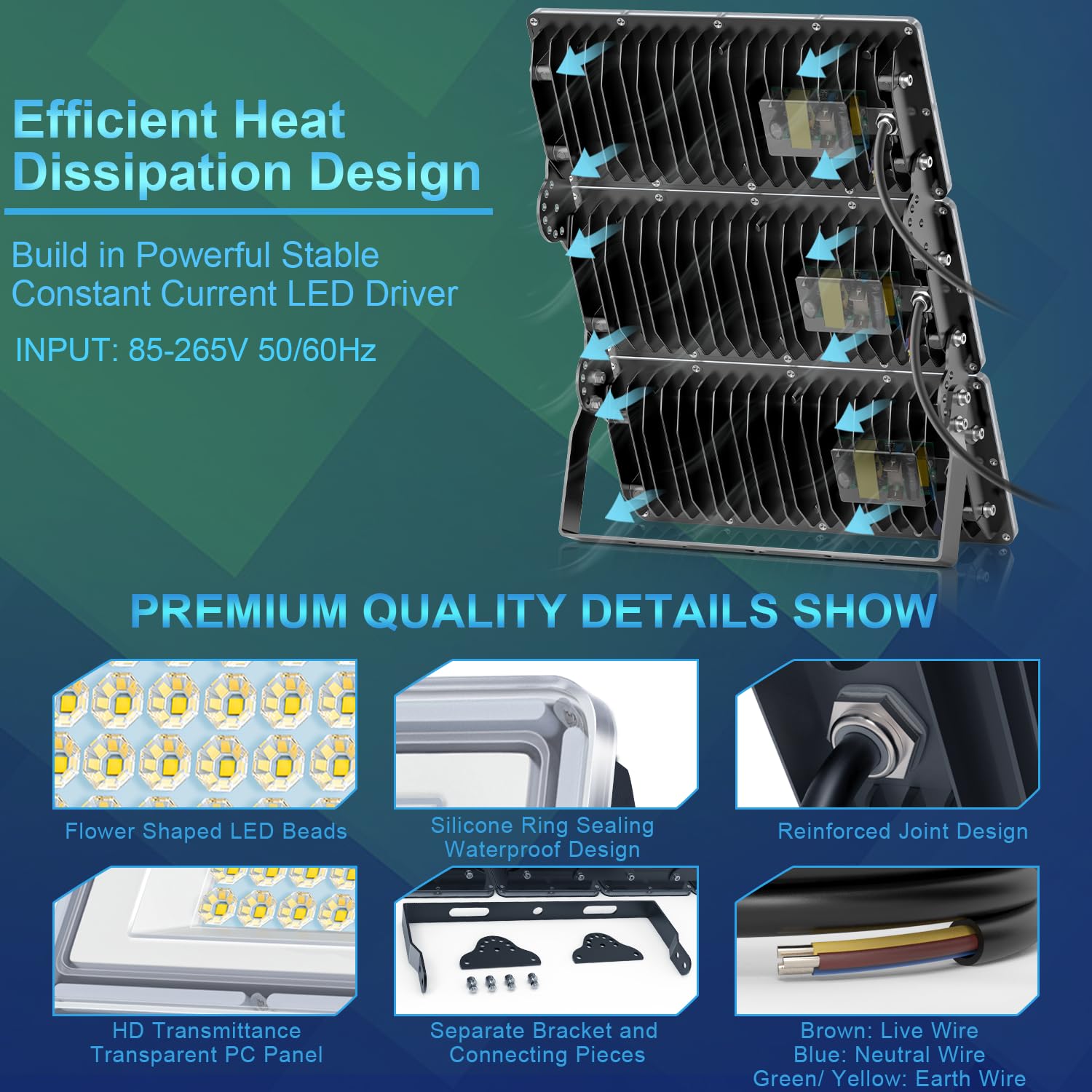 30000LM Super Bright LED Floodlight Outdoor: LED Floodlight Outdoor 300W uses 288 pieces of high-quality LED chips, energy-saving, green, long lifespan, brightness up to 100lm/w, you can save 85% of electricity, never have to worry about high electricity bills. Our floral LED floodlights have softer light to protect your eyes and provide a perfect lighting environment!