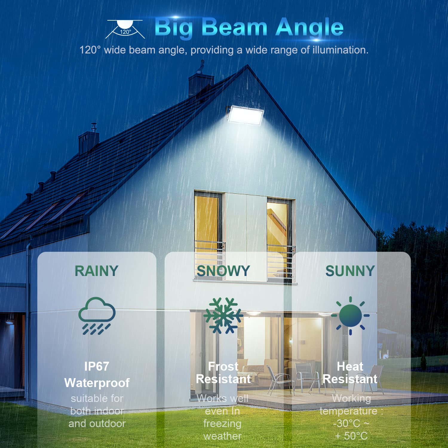 IP67 Waterproof and Widely Used: The waterproof LED outdoor floodlight is designed with a PC lens plate with a high-quality waterproof silicone strip, ensuring excellent waterproofness of IP67. LED safety lighting is suitable for yard, garden, patio, square, billboard, factory, hotel, parking lot, roof, stadium, garage, courtyard, playground, warehouse, billboard, building, street, sports field, dock.