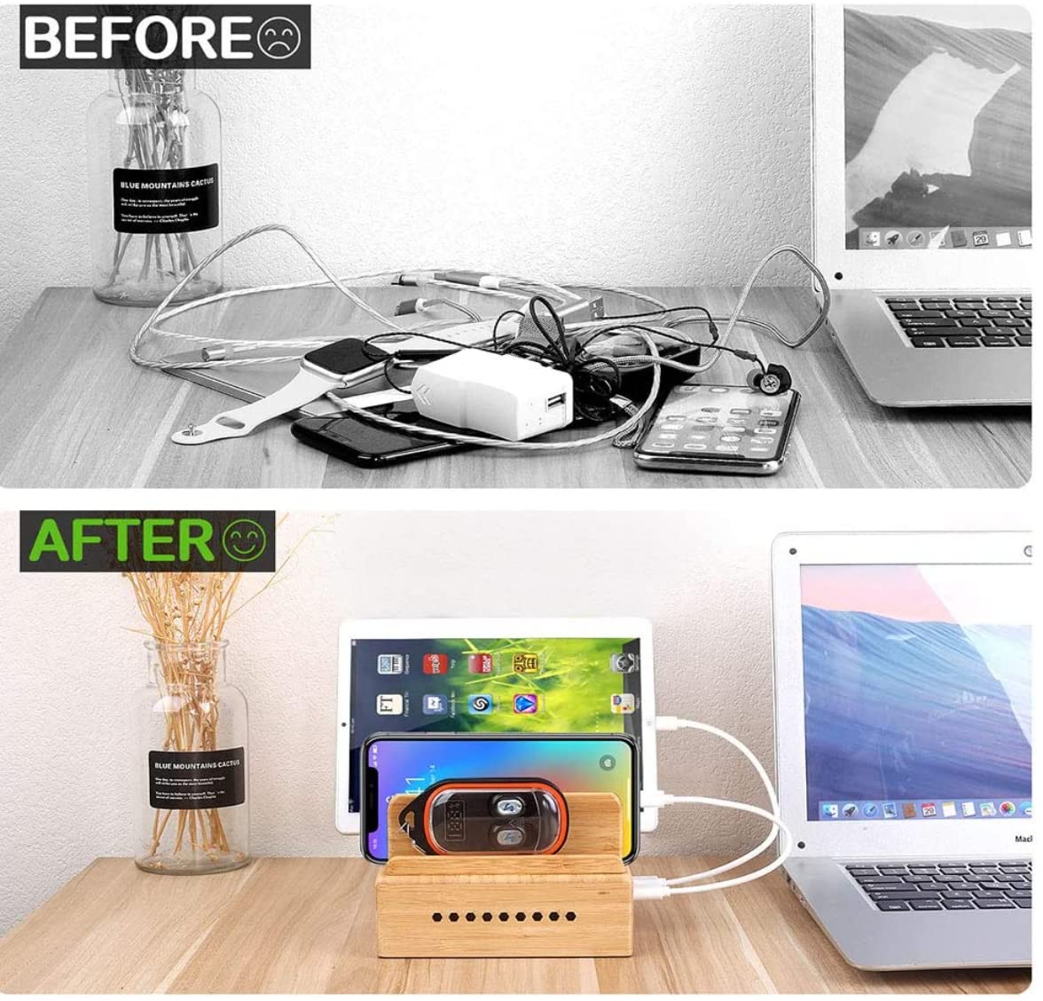 ["Built-in 5 Port USB Charger (5pcs USB charging cables included): No more cable clutter. A charging station for every phone and tablet. This compact electronic charging station keeps everything in one place - neat, clean, and tidy.", "CLEAN AND ORGANIZED - No more cable clutter. A charging station for every phone and tablet.", "FAST AND INTELLIGENT CHARGING- This multiple USB charging station features 5 slots 1-2.4A fast charging ports for various devices such as tablets and large smartphones.", "SAFETY AND PROTECTION - The rubbery base of this mobile phone charging station provides a good grip to hold on to prevent slipping. Our state-of-the-art circuitry protects against short circuit, overvoltage, overcurrent, and overcharging.", "Removable parts allow you to adjust the spacing between the dividers. You can remove and reposition the dividers to ensure all devices and tablets have the necessary space."]