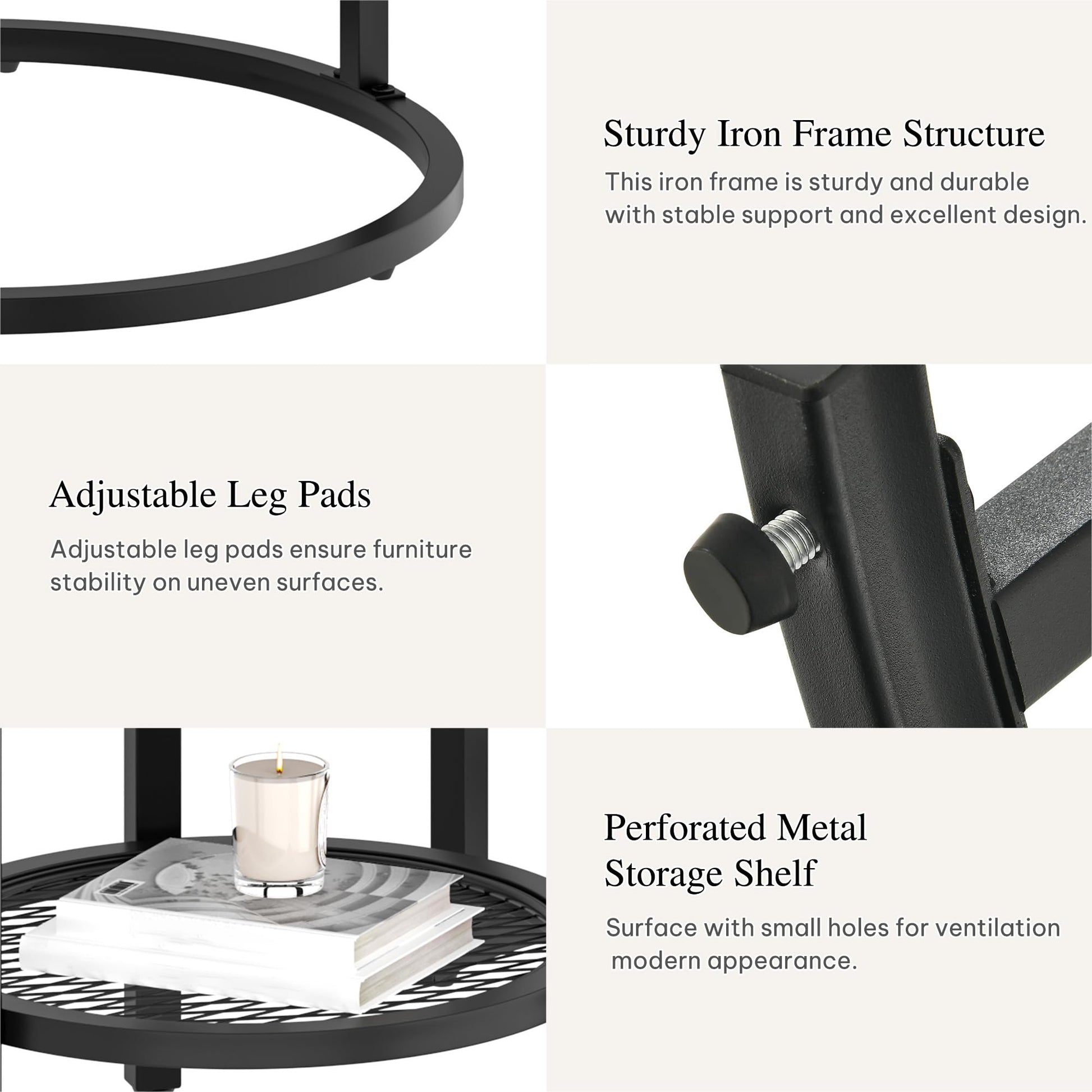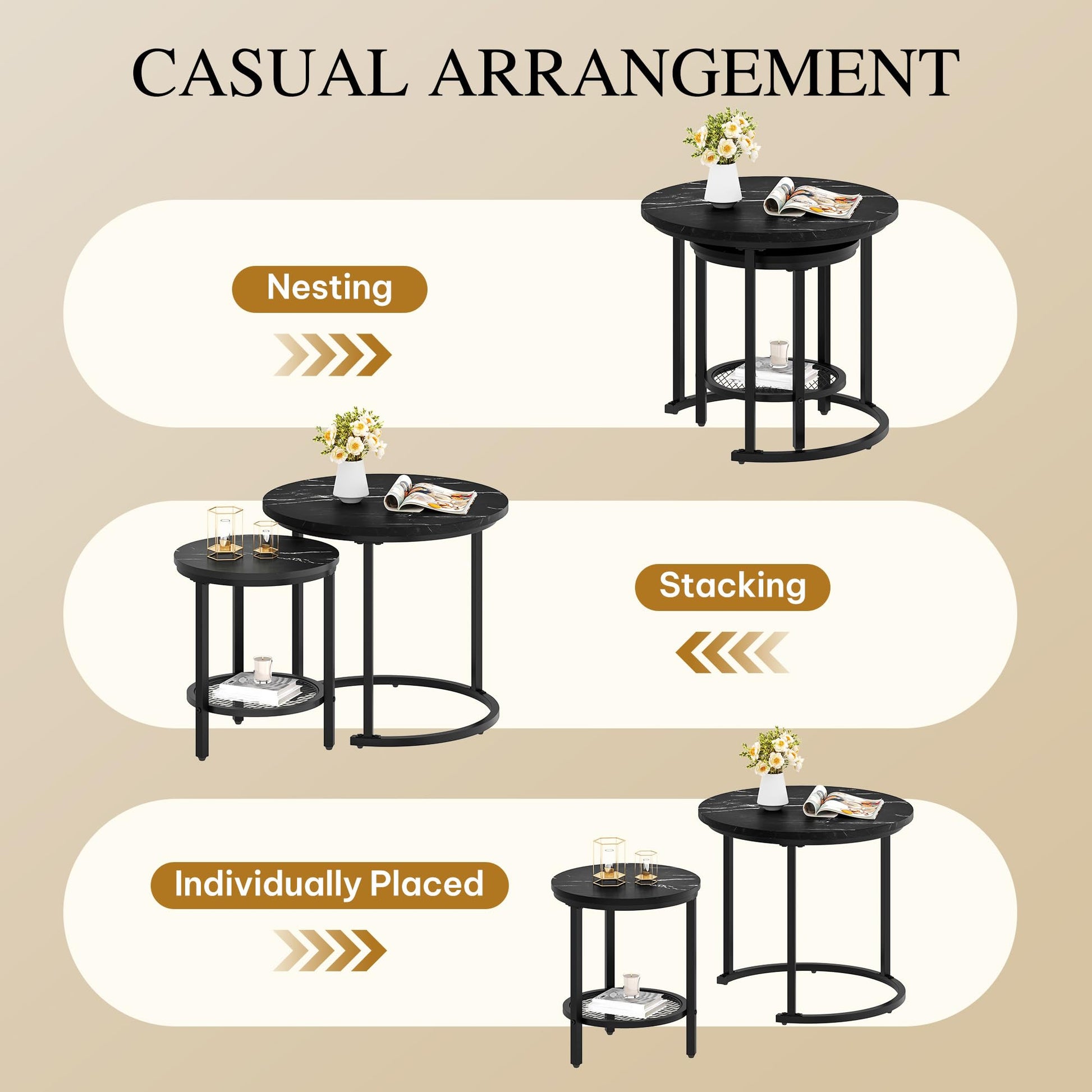 ["Coffee table 2-piece set: The coffee table set includes two round nesting tables, consisting of a coffee table (23.6x23.6x19.9 inches) and a small side table (15x15x17.9 inches), for three flexible usage options; The 2-piece stackable coffee table set can be used individually in two positions or fully stacked as a space-saving table or partially stacked to provide you with ample storage and display space.", "Round Coffee Table Modern Design, versatile applications: The black marble-look countertop combined with the simple design can be integrated into various decor styles and is versatile. The flat, smooth table design makes daily cleaning and maintenance easier. The medium size allows for use in various settings such as living room or office and meets different needs.", "Sturdy Living Room Table: Our coffee table consists of a semi-circular steel frame and a stable wood tabletop that can support up to 165 lbs. Adjustable non-slip foot pads and a sturdy metal frame also provide stability and prevent easy shifting of the table, the black table top is coated with a scratch and stain-resistant surface.", "Minimalist, modern design: The clean, round shape combined with wood materials creates a cozy, natural living atmosphere. Our round coffee table is more suitable for family use than other rectangular coffee tables, as the rounded corners avoid accidental bumps and scratches.", "Easy Assembly: You can assemble the wood coffee table set in 30 minutes with all necessary tools and instructions included in the package; You can also view the instructions on the product page; simply wipe clean with a soft damp cloth if dirtied."]