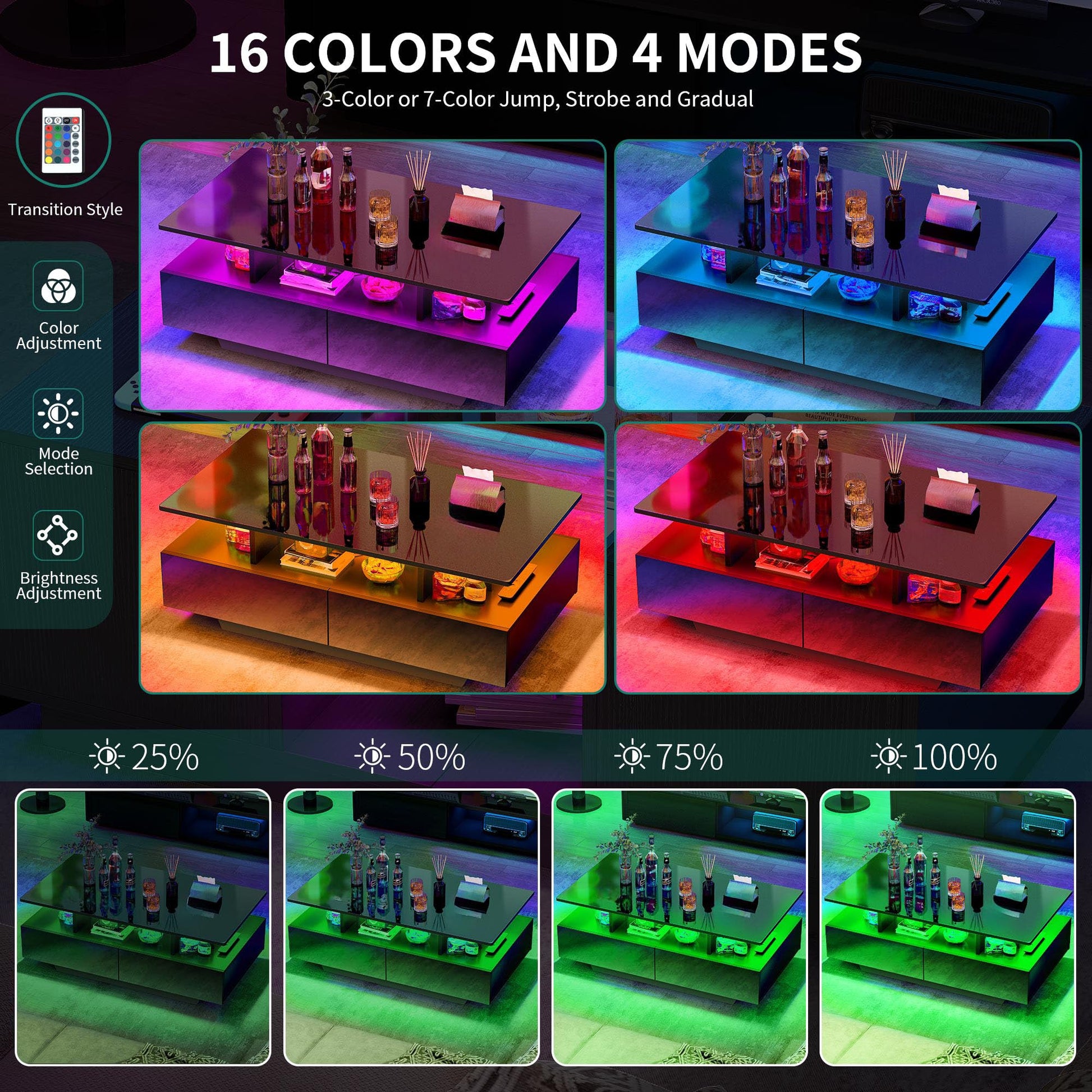 ["LED Coffee Table: Set the mood by adjusting 16 captivating colors, 4 dynamic modes, and brightness via the coffee table's remote control. From cozy evenings to lively gatherings, this modern LED coffee table has it all covered.","Coffee table with storage: With spacious open storage and four drawers, our living room table provides space for smart organization and storage of all your essentials, keeping your space neat and tidy.","Multifunctional black living room table: Our 2-in-1 coffee table also serves as an LED light source! Enjoy the minimalist design that complements any decor - at home, office, or store. Infinite possibilities in one table!","Sturdy construction: Made of high-quality particle board, this high-gloss storage table is sturdy and easy to clean. Additionally, the durable drawers close smoothly and quietly. Enjoy years of durability and style.","Easy to install: Installing this black coffee table is a breeze with clear diagrams and tools included. Need help? Our dedicated service team is available."]