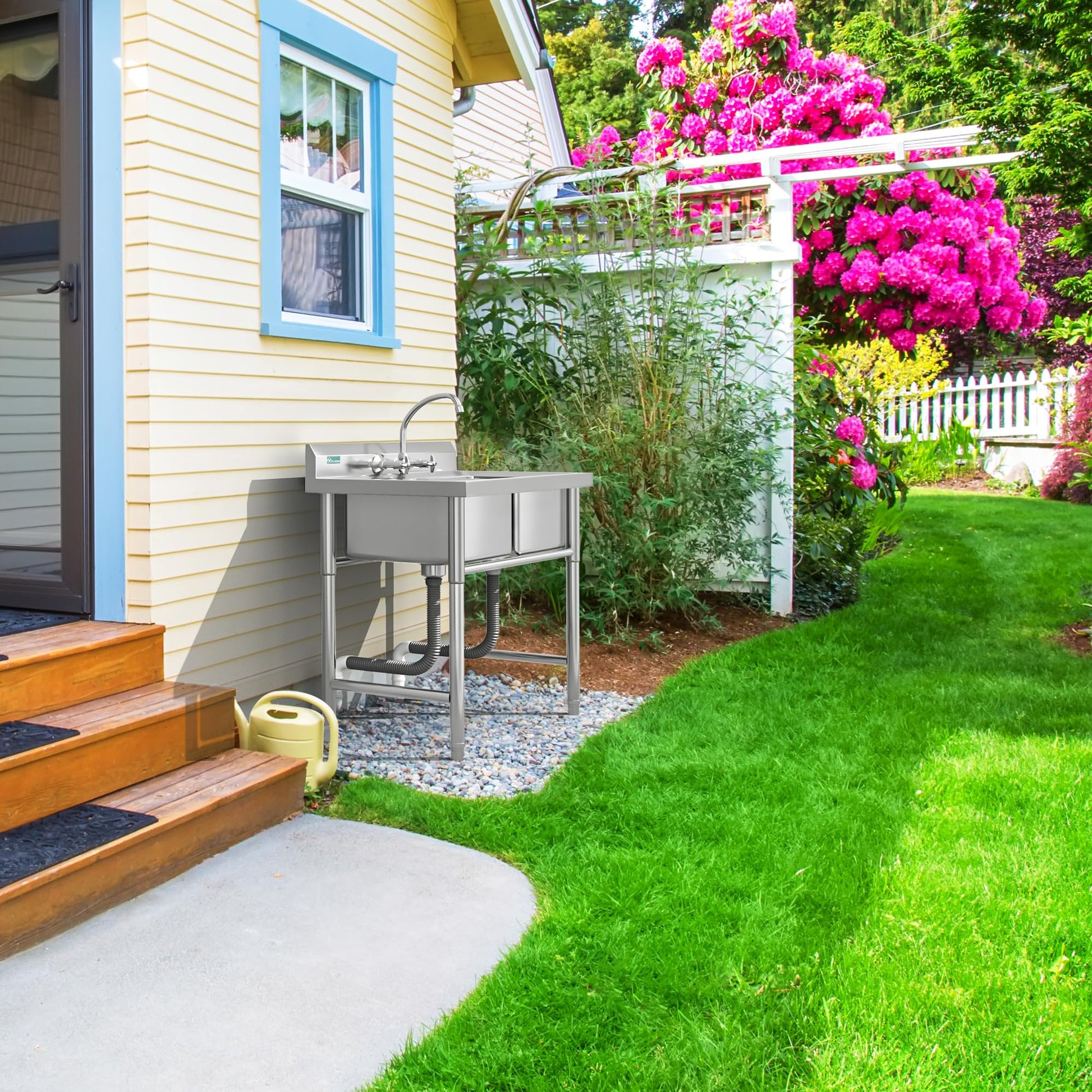 ["High-quality stainless steel: The freestanding sink is extremely resistant to corrosion, oxidation, and deformation, ensuring long-lasting durability without rust or deformation and no fear of leaks","Large capacity: The sink has a total size of 100 x 60 x 94 cm, a bowl size of 40 x 40 cm, and a depth of 22 cm, making it suitable for washing dishes and even clothes; Equipped with a 3-1/2-inch stainless steel strainer that effectively catches food and dirt, ensuring a bright and clean working environment and preventing drain clogs","Easy to clean: The kitchen sink is equipped with a 10 cm high backsplash that effectively repels splashes of dirty water and keeps your walls clean; The outdoor utility design features streamlined, rounded corners and edges, making the countertop easy to clean and maintain its stainless steel shine","Freestanding commercial sink: The restaurant sink station features a sturdy design with horizontal bars on the bottom of the support for long-term durability; The four feet can be rotated for height adjustment, adapting to uneven floors and protecting your floors from scratches","Versatile sink: Our double sink set is perfect for handwashing and cleaning food, fruits, and vegetables in kitchens, bars, laundry rooms, shops, restaurants, dessert shops, clean rooms, cafeterias, garages, and other commercial spaces; Wherever you need to use it, it will surely meet your needs and provide maximum convenience"]