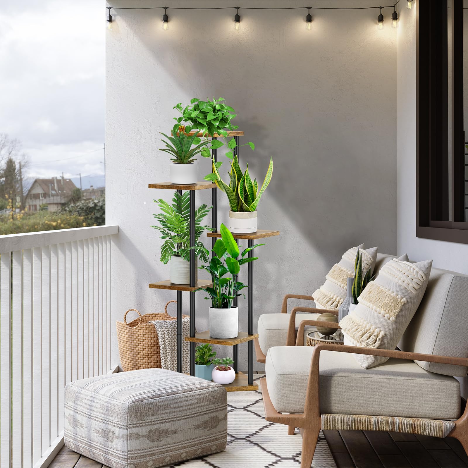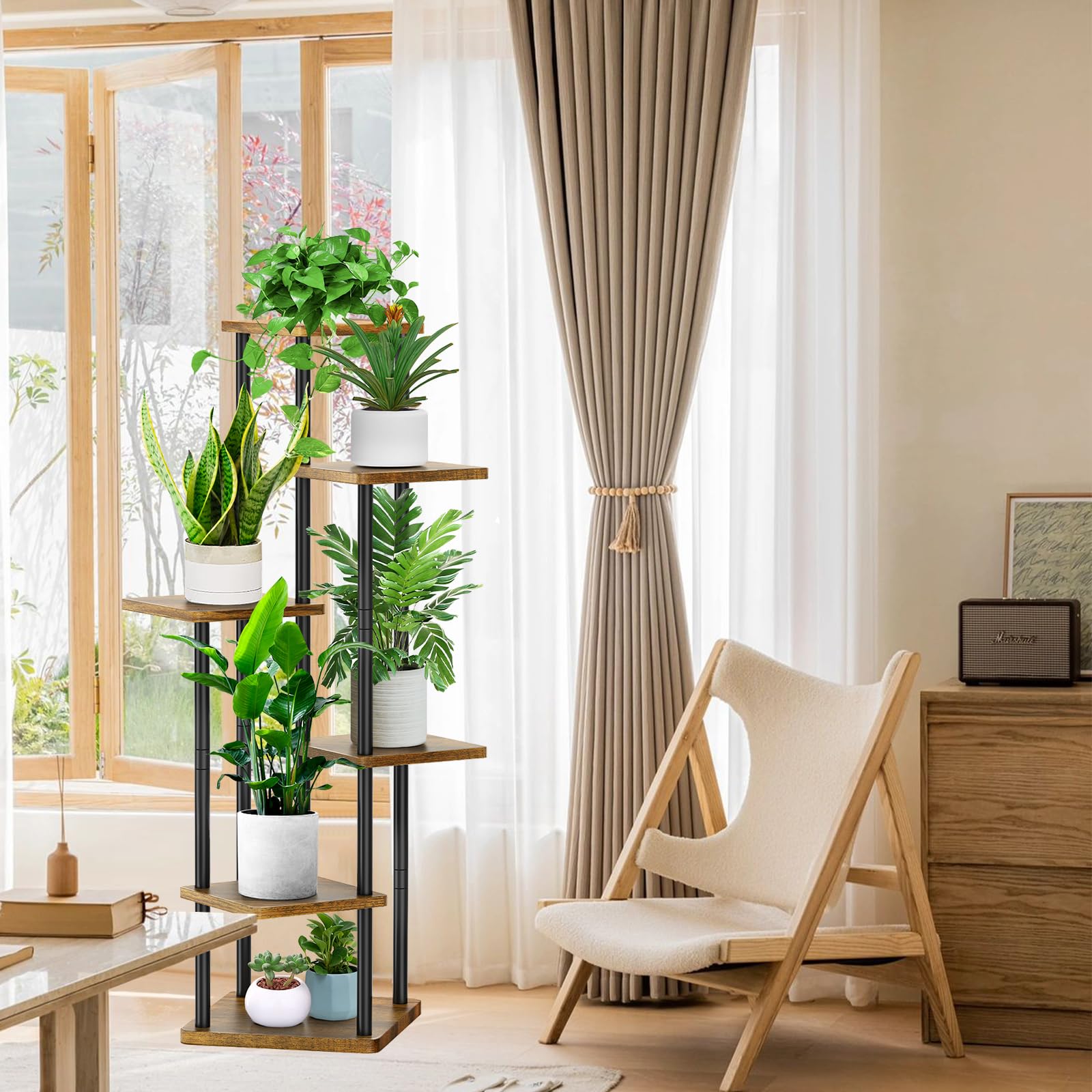 ["Multi-storey design for large capacity】6 layers Metal Garden Tiered Plant Stand, accommodating 6 or more flower pots at the same time. Tiered storage, allowing plants to receive plenty of light.","【Sturdy & durable】Upgraded quality metal frame, equipped with thickened wood (MDF) reinforced base, our Plant Pot Stand has strong load-bearing capacity and stability, not easy to crack or deform.","【Elegant decoration & space-saving】Minimalist style, wood grain board with metal frame, Vintage Plant Stand Rack pairs well with your home decor in the living room, corner, balcony, hallway, garden, patio, etc.","【Anti-slip design & easy to install】A round foot pad at the bottom not only prevents scratching the floor, but also balances the plant stand. You can easily assemble this plant container by following the instructions.","【Wide applications】Multifunctional flower pot holder shelf can not only display your beautiful plants to decorate your living room and balcony, but also be a bookshelf in your study and display family portraits or photos with beautiful memories and championship trophies in the bedroom."]