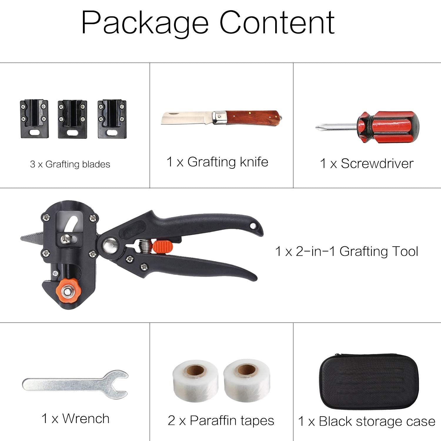 Package includes: 1x carrying bag, 1x grafting cutting tool, 3x grafting blades, 1x grafting knife, 2x grafting tapes, 1x wrench, 1x screwdriver. With carrying bag, convenient for storage and transportation."