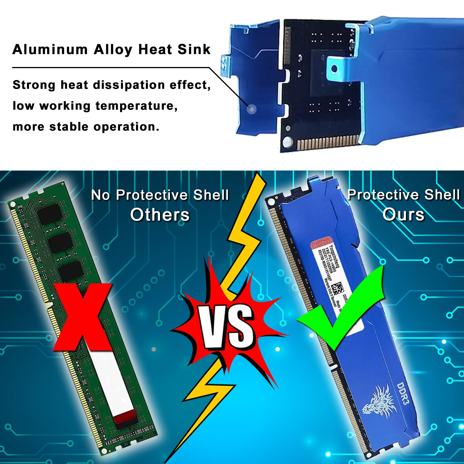 4. Stability: High-performance memory granule Double rank memory distribution, combined with a unique thermal design, wide range of voltages, maintaining the best performance at all times. Security: The appearance of an aluminum alloy heat-drawn net helps dissipate heat and prevent static electricity.