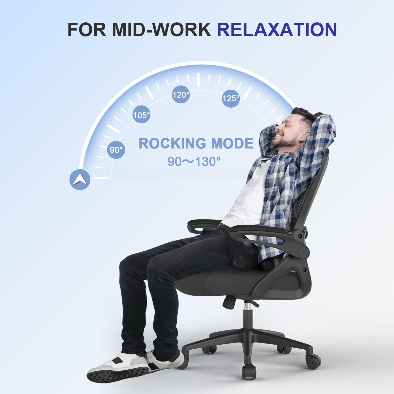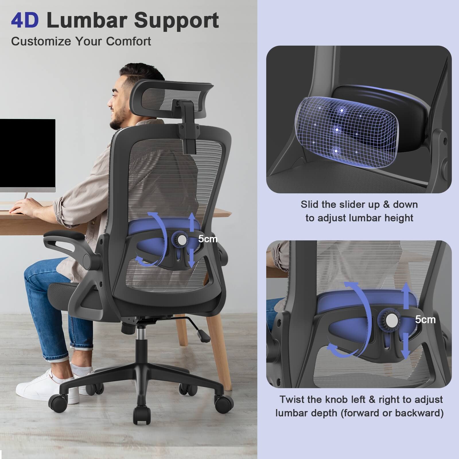 ["【Ergonomic Office Chair】The high-back office chair is equipped with an ergonomic design, with lumbar support, adjustable armrests and headrest, and height, which has improved the ergonomic function to provide you with comfort all day long. And you can tilt the backrest by 90 ~ 130 ° in 3 positions, you can rest or sit straight freely to focus better on work.","【4D Lumbar Support】The adjustable and padded lumbar support allows you to align where you want to focus on ergonomic support. You can adjust the lumbar support up / down or forward and backward to achieve excellent spinal support. This helps you maintain better sitting posture.","【90° Adjustable Armrest】You could turn it into an armless office chair, fold up the armrest to slide it under the empty desk to create a high-performance space. Or if you want to rest your hand, the padded and soft armrest is a perfect point to type at your desk.","【Breathable Mesh Chair】Waterfall seats provide a wider and firmer seating experience. Breathable mesh backrest and seat ensure that air can circulate, keeping your back and hips cool and comfortable at all times.","【Sturdy and Reliable Office Chair】The office chair has passed the BIFMA & SGS and supports up to 300LBS/136 KG. Recommended height: 150 cm to 189 cm. Ideal size for maximum comfort.","【Easy to Assemble】The office chair is easy to assemble in 6 steps and comes with tools and clear instructions. Try out this ergonomic office chair and enjoy your home office life now."]