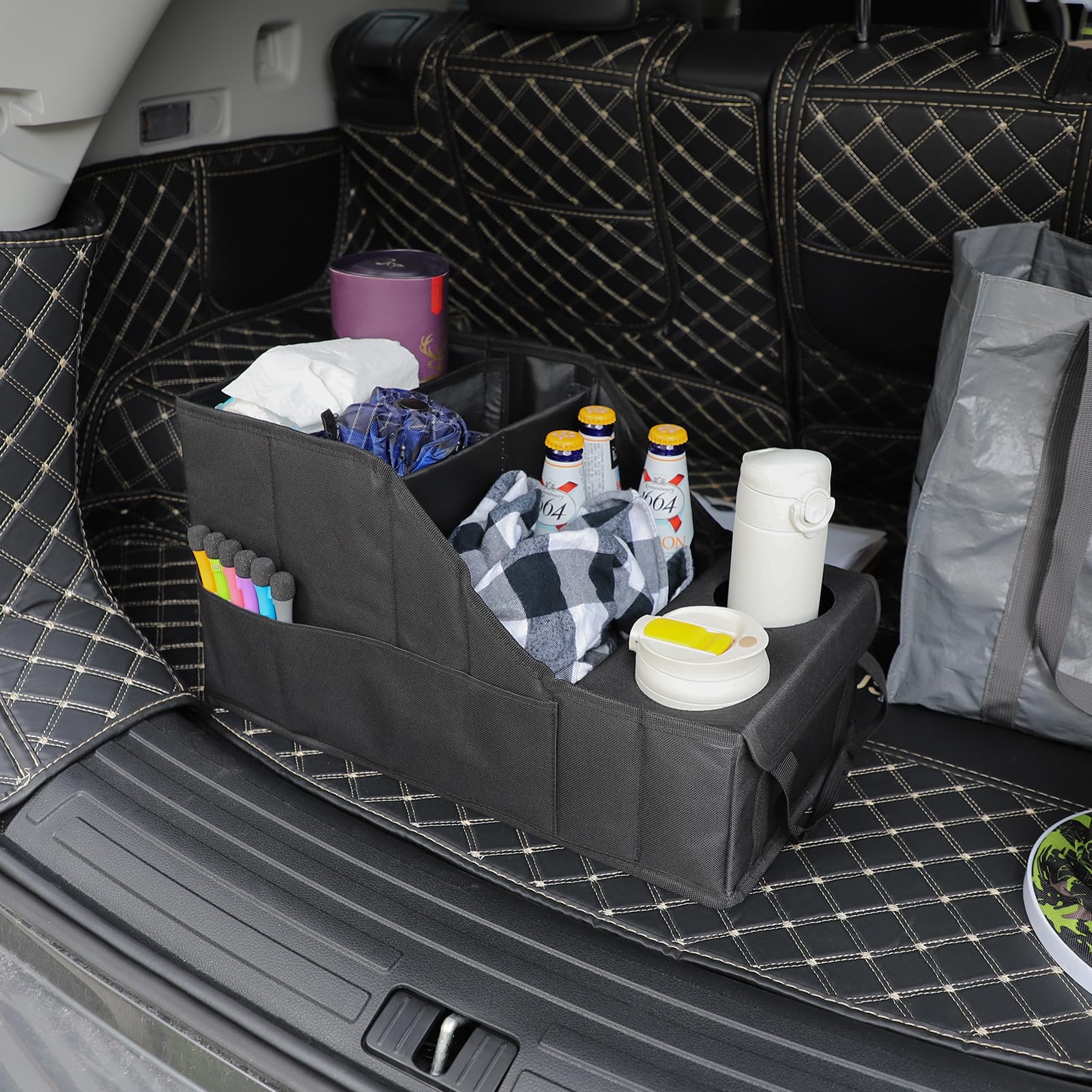 "[Honeycomb plate] The unique honeycomb plate design gives the organizer durability and stability, ensuring that it stays steady even during bumpy rides or quick stops.",