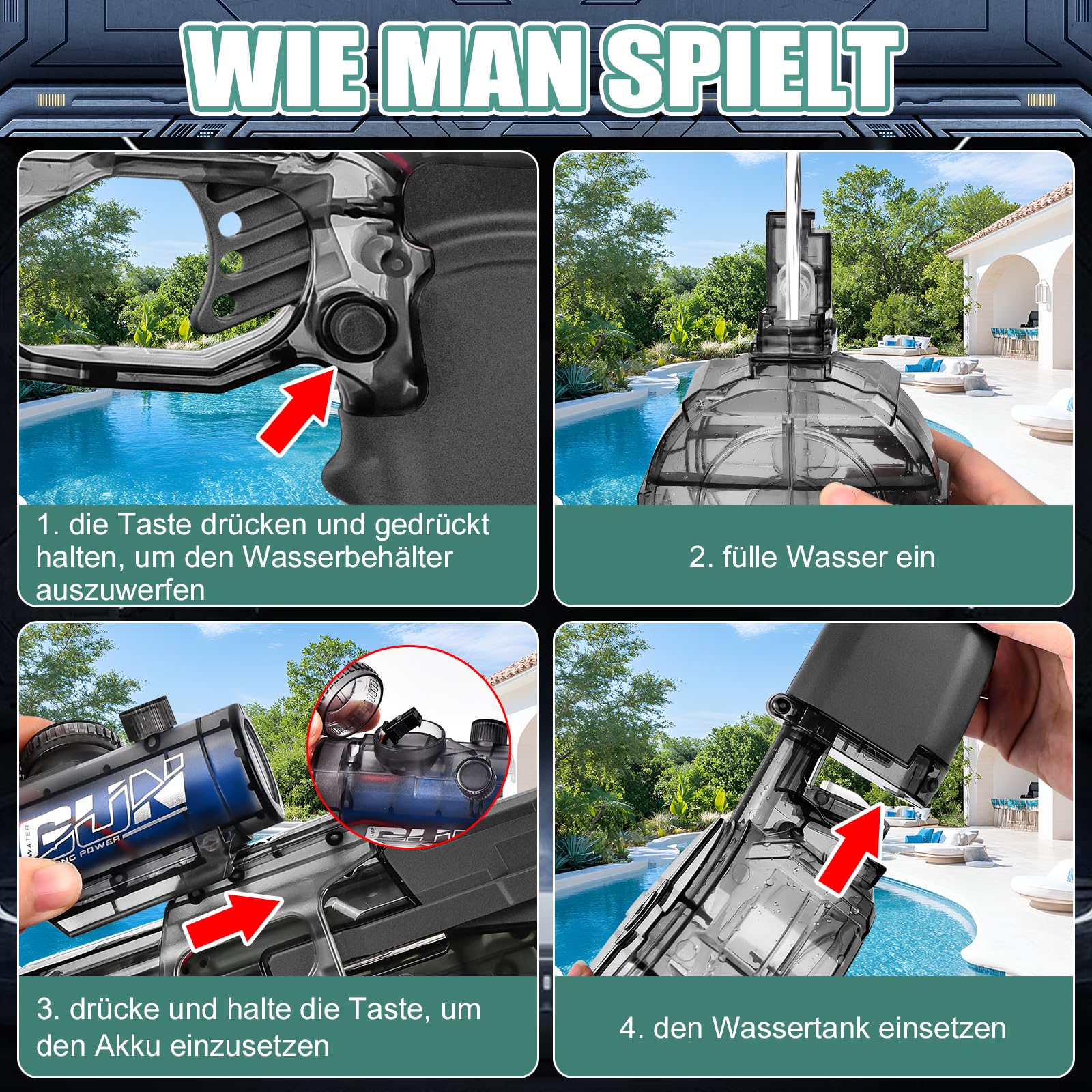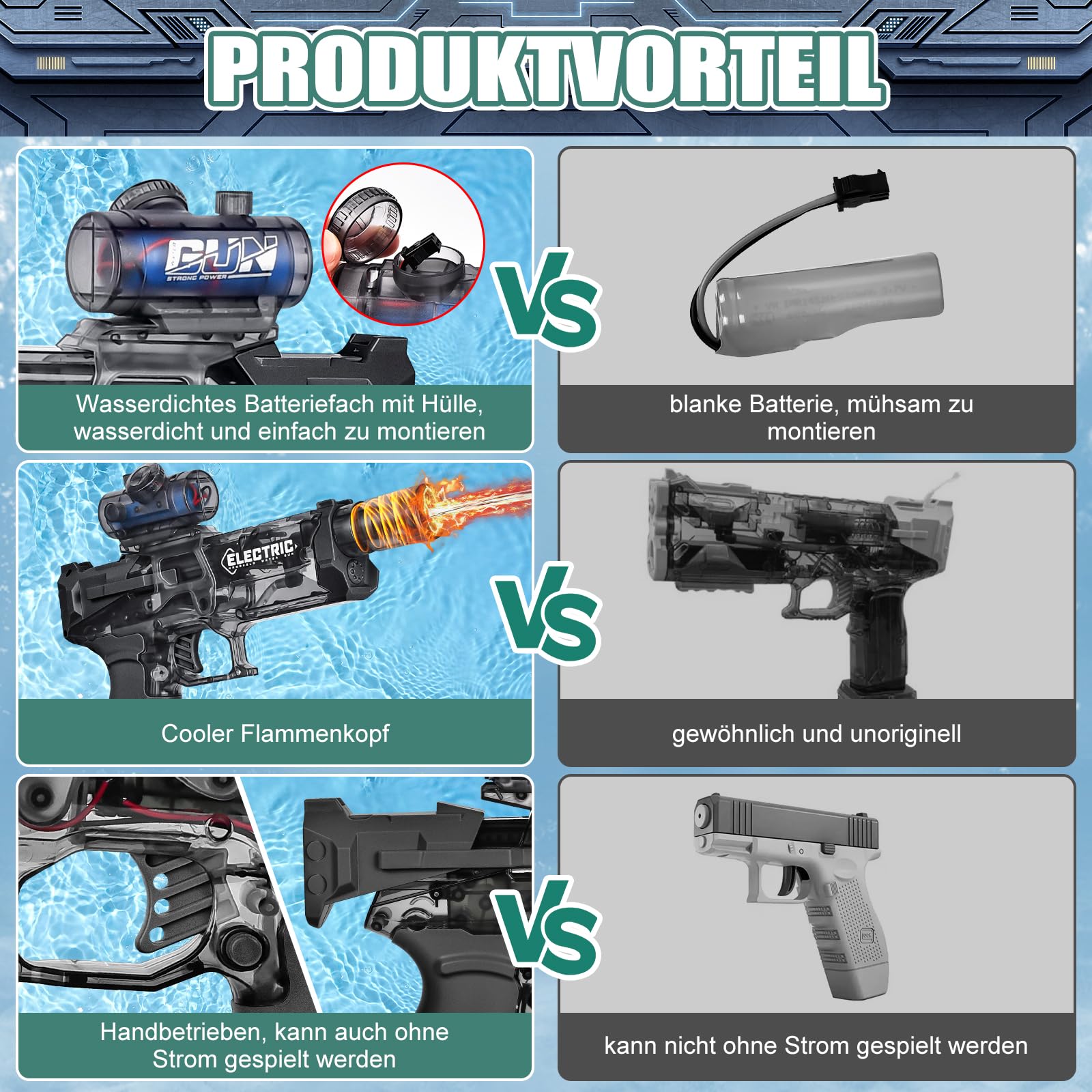 ["🔋【Hidden batteries, easy charging!】 Say goodbye to frequently changing batteries! The high-performance battery of this Electric Water Gun is cleverly hidden in the housing, which does not affect the aesthetics and ensures easy charging. Simply remove the scope, and the battery will quickly recharge, so you never have to worry about interrupting a battle with a dead battery. Additionally, thanks to the powerful, waterproof construction, you can engage in water battles without worrying about damaging your water gun by submerging it in water!","💥【Colorful LED effects for unforgettable experiences】 Still looking for an Electric Water Gun that will make you shine even at night? Every time you pull the trigger, the Electric Water Gun synchronizes with the flashing LED light and inspires you to fight! The dazzling light effects provide an extraordinary experience, as if you have entered the world of a science fiction movie!","💧【Extra large tank for strong range!】 The 500ml capacity of this Electric Water Gun is large enough to "relentlessly" shoot during water battles! Additionally, our 1200mAh battery lasts over 40 minutes on a single charge, so you don't have to worry about running out of juice in the middle of battle. Quickly refill the water and keep playing, ensuring you will last until the end of a water battle!","🔫【Realistic recoil for even more fun!】 Every time a water bullet is fired, the end of the Electric Water Gun slightly recoils like a real pistol and then quickly jumps back into the correct position. This subtle recoil allows you to fully immerse yourself in the game, as if you were really standing as a warrior in the desert facing your enemies. With its dynamic design, the Electric Water Gun is no longer just a toy, but enters the world of realistic water combat!","🎁 【Extra large range, precision shots!】 Want to hit your opponents accurately at long distances? With a range of up to 10 meters, this Electric Water Gun makes it easy to gain the tactical upper hand, whether you're in the garden or in a water gun battle with friends! The greater the range, the more you can test your accuracy and intelligence. This Electric Water Gun makes you an unparalleled shooter on the battlefield!"]