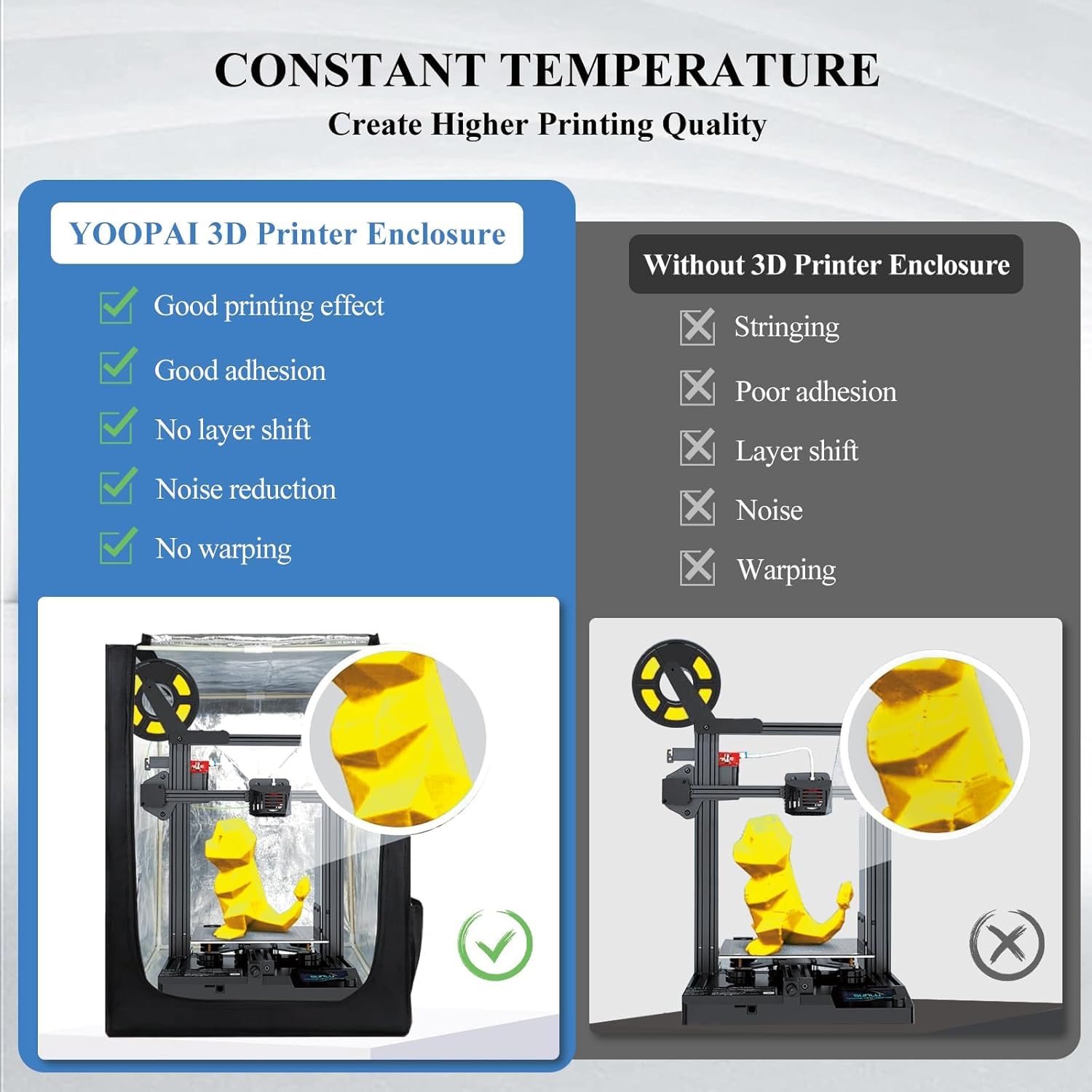 "Improved print quality through constant temperature: Provides a stable and controlled environment for your prints. Maintaining a constant temperature during printing ensures that you produce high-quality prints while avoiding print errors and material waste. The constant temperature reduces the risk of material clogs and jams, increasing print speed and efficiency.