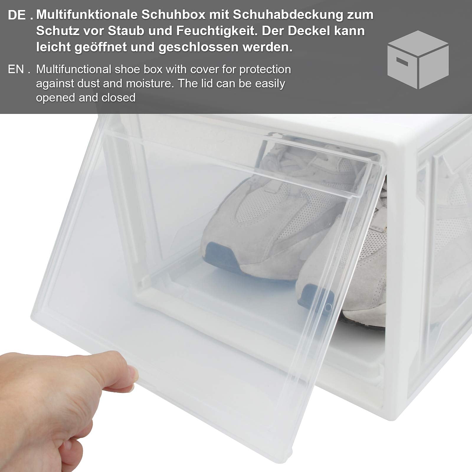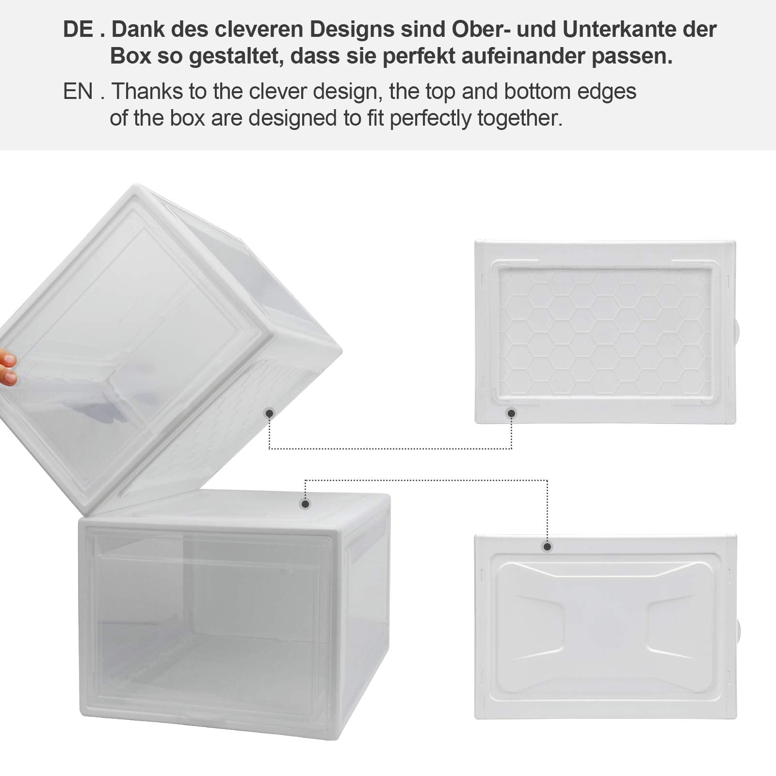 ["Transparent design on three sides: With the three-sided transparent shoe box design, you can see the contents of the box without opening it, allowing you to quickly choose the right one","Easy assembly, space-saving: Assembly and disassembly can be done in less than a minute, easily eliminating the problem of a bulky shoe rack in a small corner","Large capacity, High quality material: Each box is large enough to fit all shoes up to size 48. The boxes are made of innovative PP material. The walls are thick enough to prevent easy damage. They have high load capacity and can withstand pressure and deformations","Anti-tip design, Free combination: Thanks to the clever design, the top and bottom edges of the box are designed to fit perfectly together. Multiple boxes can be stacked stably without swaying or slipping","Versatile use: Not only for storing shoes, but also as storage for clothes and small items in the kitchen, bathroom, under the bed, and more"]