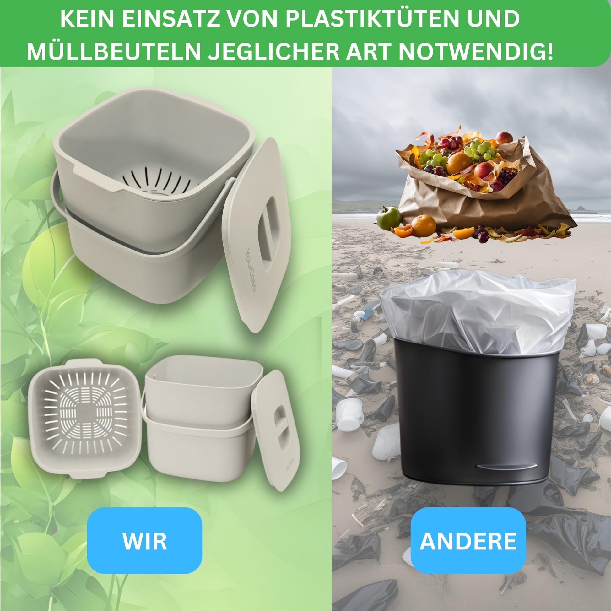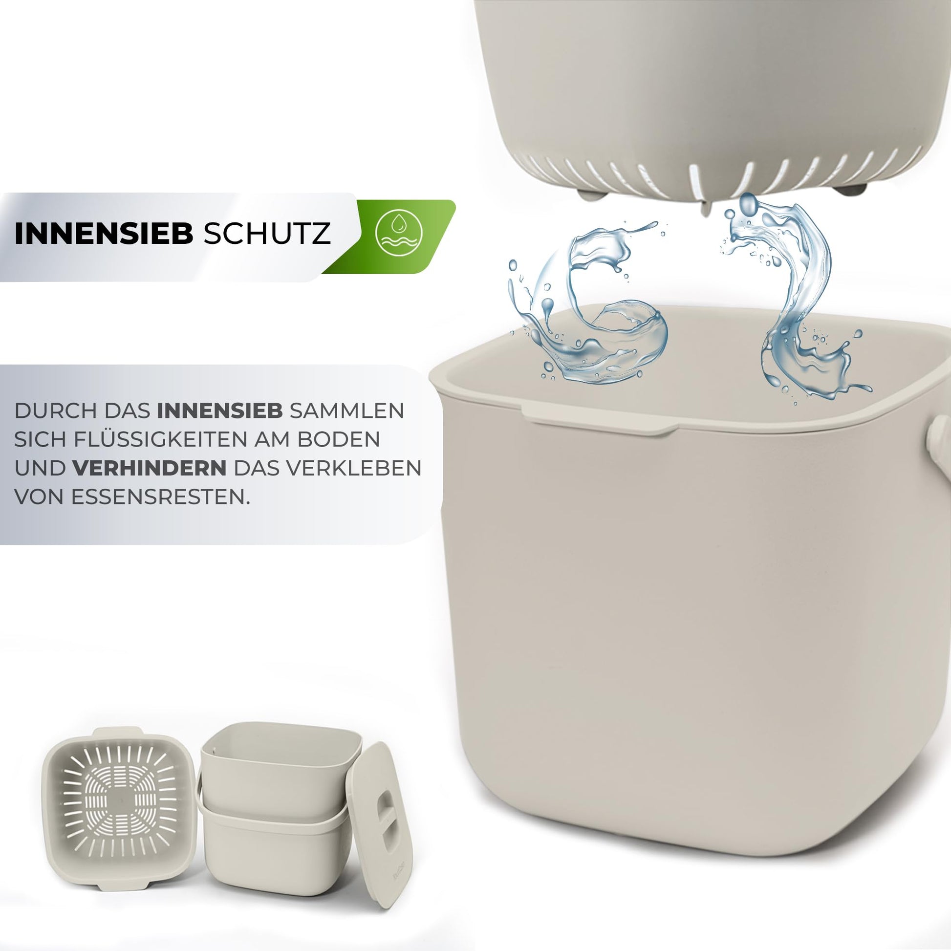 ERSTES KOMPOSTIERMITTEL MIT HERAUSNEHMBAREM SIEB - kein lästiges festkleben von Essenresten am Komposter durch das herausnehmbare Innensieb. Somit bleiben Flüssigkeiten und der Bio Abfall getrennt. Bei den meisten Kompostern trocknet der Bio Müll an und lässt sich sehr mühsam vom Bio Mülleimer entfernen.