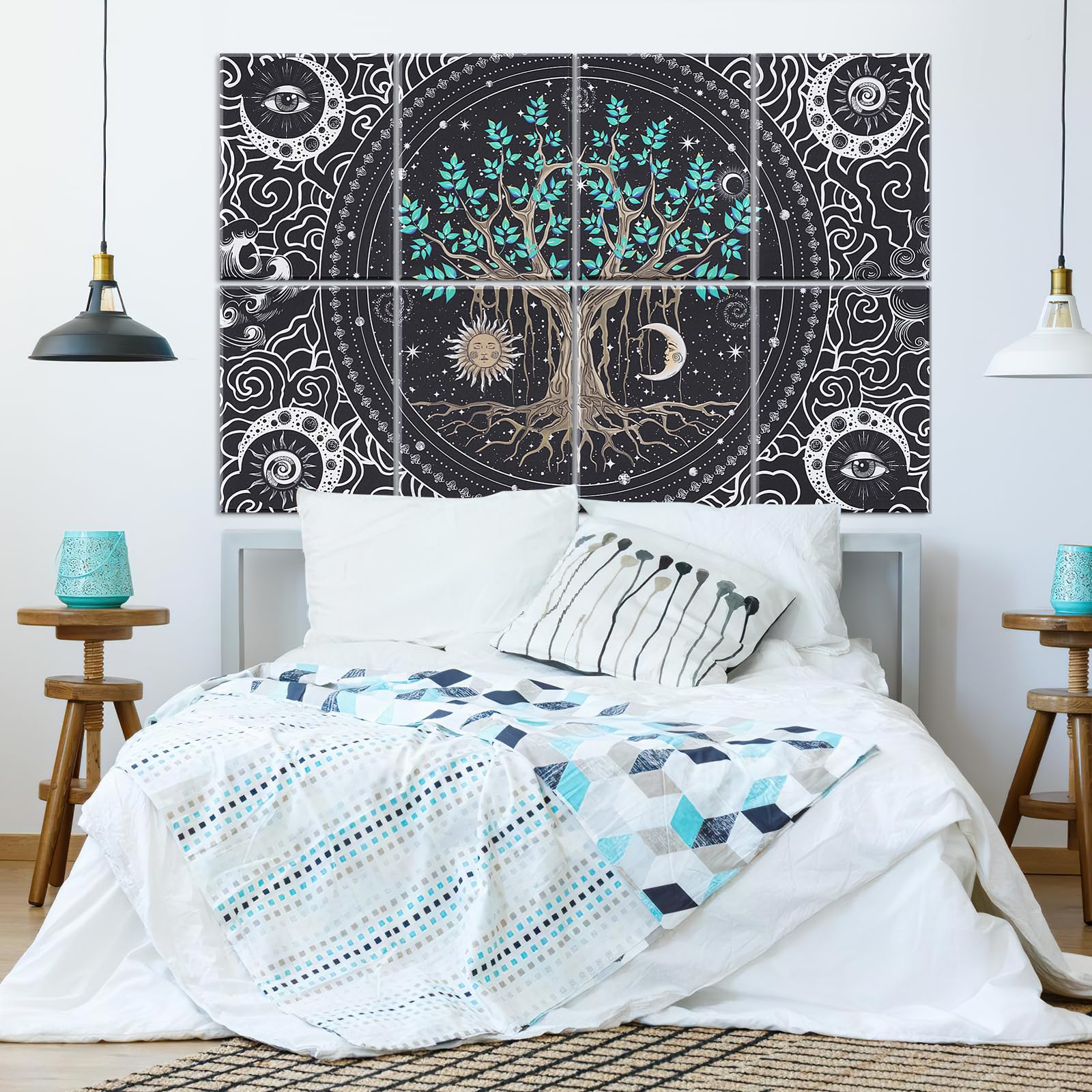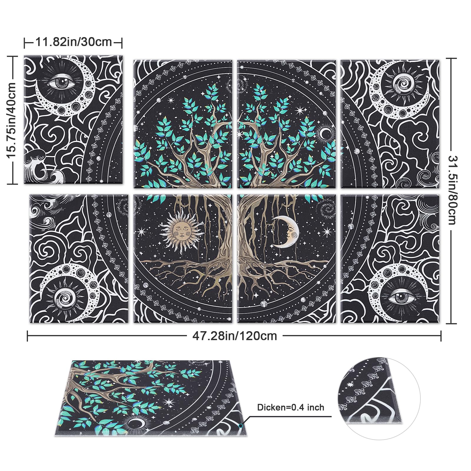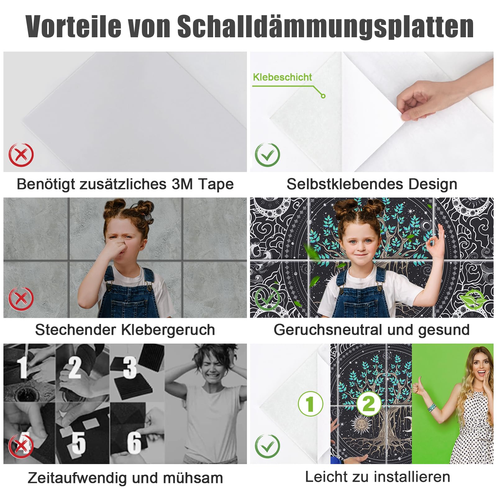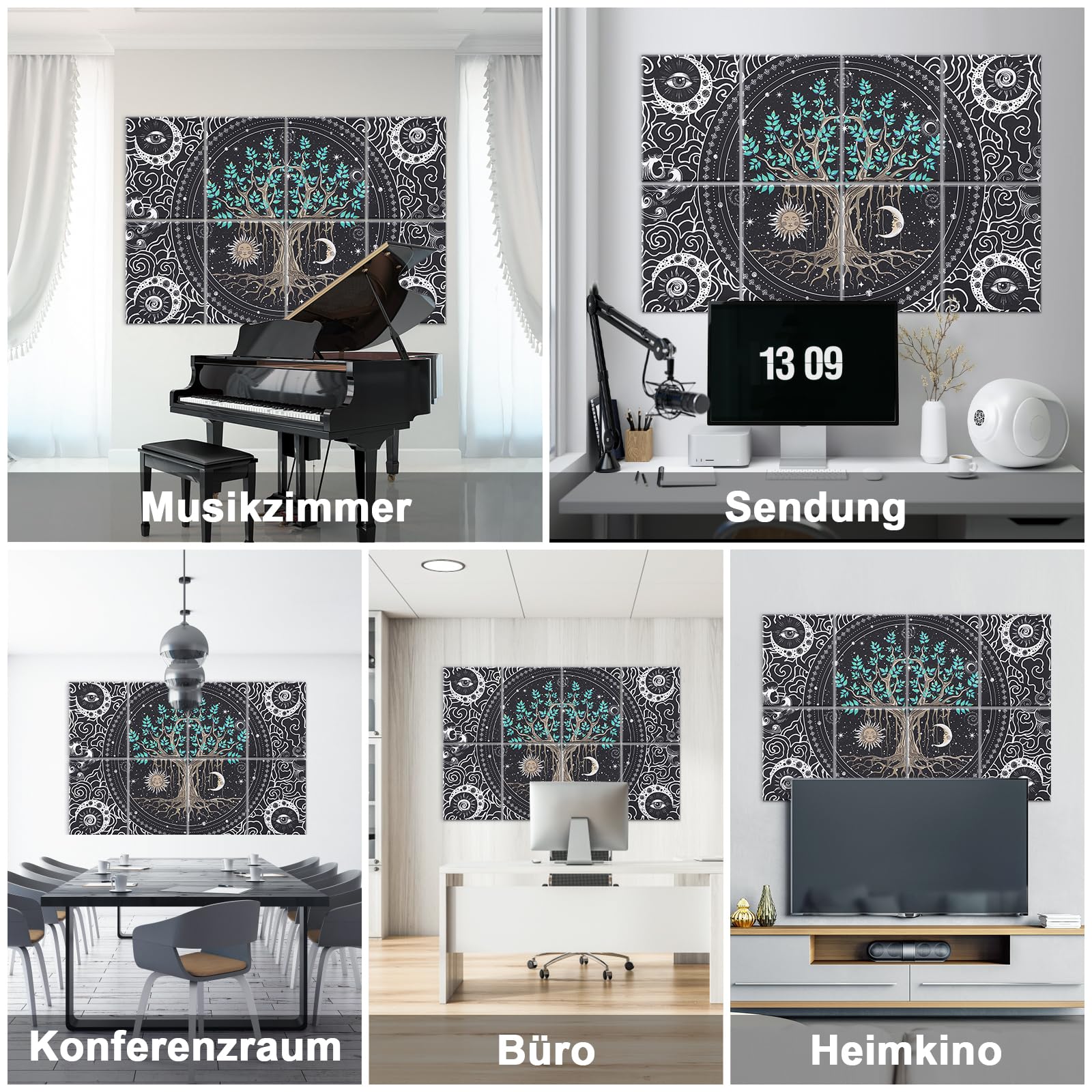 "High Density Material: These 8 pack acoustic panels are made of high-density polyester fiber material, ensuring a noise reduction coefficient of 0.92 degrees and a sound absorption coefficient of 0.8 degrees. The soundproof acoustic panels are not only wear-resistant and scratch-resistant, they are also odorless, non-irritating, flame retardant, safe to breathe and touch, providing you with a comfortable and quiet space","Tree Moon Pattern Design: Self-adhesive acoustic panels wall panels include 8 pieces of acoustic panels, sound-absorbing panels measuring 30 x 40 cm and the total size is 80 x 120 cm, large enough to meet your acoustic treatment needs. The sound absorber wall panels are designed with a Tree Moon pattern, hanging on the wall like a decorative painting, can not only decorate your room, door and ceiling, but also reduce noise and improve the quality of the room","Excellent Sound Absorption: 9.7 lb/ft³ high-density soundproofing sound-absorbing wall panels effectively absorb reverberation, unwanted acoustic reflections, unwanted noises and reduce sound waves. They are ideal for playrooms, practice rooms, concert halls, home theaters, and more. In addition to using acoustic panels for sound damping and improving the acoustics of a room, they can also be used to decorate your room","Easy to Install: 30x40x0.9cm acoustic panels have self-adhesive labels on the back, peel off the self-adhesive labels, no special tools or materials are needed, it can be easily stuck on any smooth and clean surface. The acoustic panels can be firmly attached to the wall and will not fall off. You can also design different adhesive patterns for the acoustic panels to create your own acoustic wall panels","Acoustic Panels Usage: Noise reduction acoustic panels are ideal for soundproofing walls in recording studios or offices, can be firmly attached to the wall, absorb sound waves and improve soundproofing effects, suitable for home theater, playrooms, practice rooms, concert halls, etc., to create a private, quieter environment; they can also be used to decorate the door, ceiling, room, etc., is a good choice for wall decorations and sound insulation"